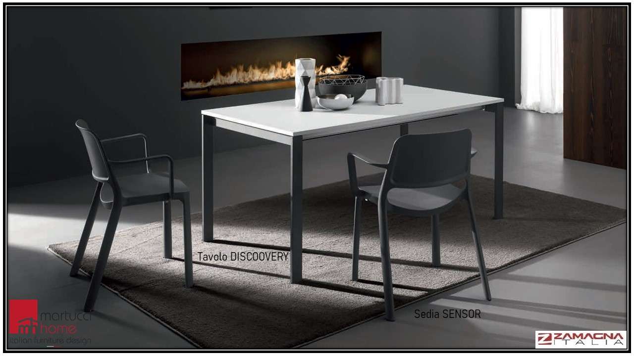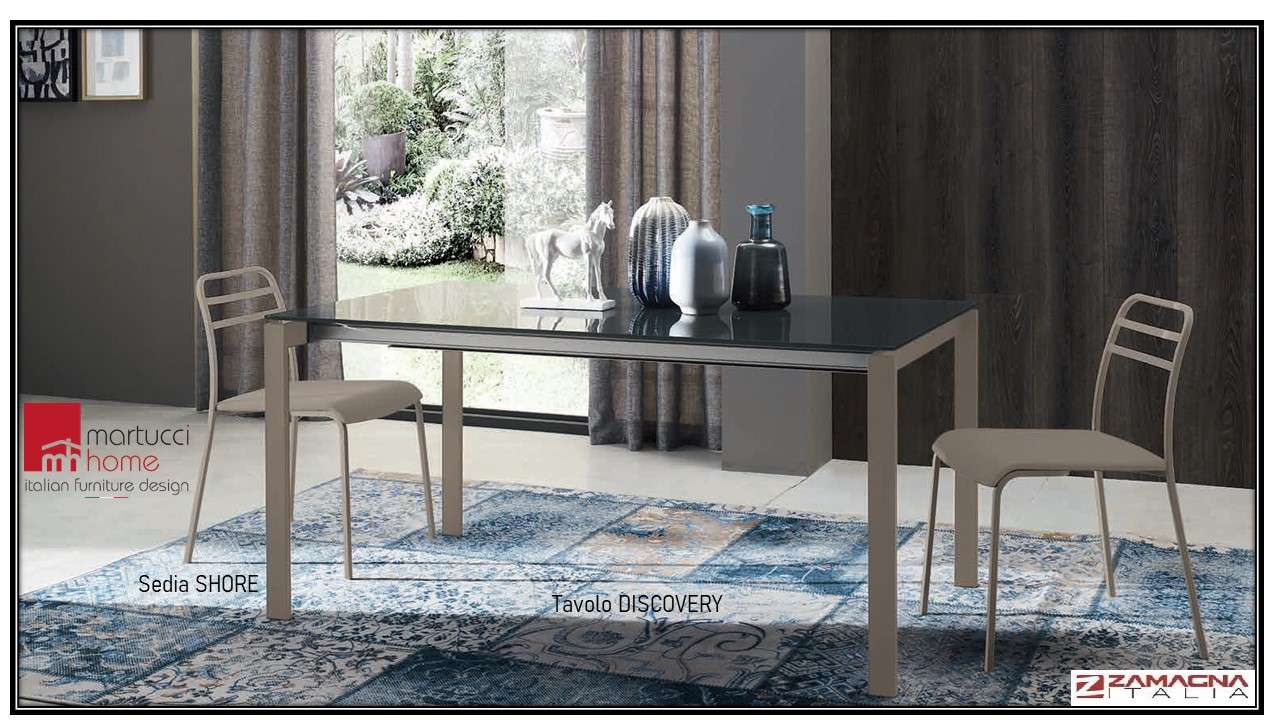 allungabile telescopico con gambe a ponte in metallo verniciato, struttura/meccanismo in alluminio anodizzato, piana in vetro, ceramica, melaminico o laminato e allunghe in melaminico o laminato in tinta.