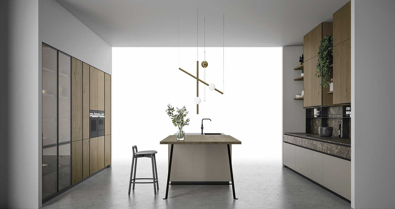 Cucina a isola in rovere Scalfito Bronzo, Stratificato HPL Pietra Emperador e vetro laccato Cappuccino. Le funzionalità sono separate e ben marcate in spazi simmetrici. È la chiave di volta per dare movimento a una disposizione perfettamente speculare.