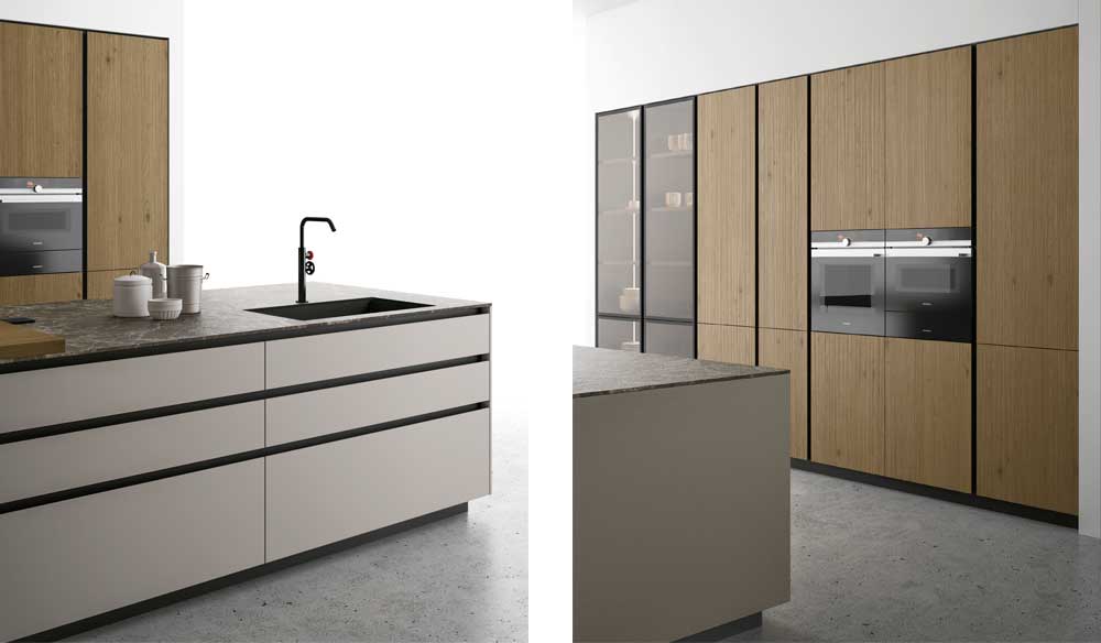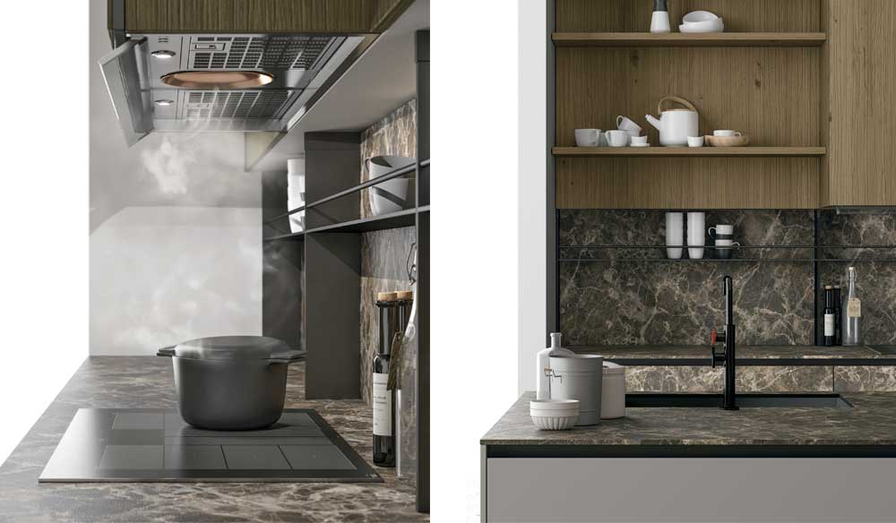 Il carattere della composizione nasce da dettagli come le tre gole dell’isola, che abbinano cestone e due cassetti, contrapposte alle due gole delle basi a muro, composte da cestone e cassetto. Quest’ultimo è in Stratificato HPL Pietra Emperador, elegante ripresa del top sovrapposto. L’ampia area riservata alle colonne in rovere Scalfito Bronzo, incassate nel muro, è completata dagli elettrodomestici integrati a vista e da due moduli con telaio in metallo nero e vetro trasparente bronzato. Ai piani cottura a induzione serve una cappa aspirante che eviti l’effetto condensa, canalizzando il vapore nell’aspiratore. La cappa Indy soddisfa appieno questa caratteristica. Il top dell’isola è in laminato bordo Unicolor pietra Emperador, con il dettaglio del bordo che mantiene la continuità del materiale. Nella parte in linea a parete che si intravede dietro, l’elemento in metallo in appoggio sopra-top si interpone fra le basi e i pensili e crea pratici ripiani d’appoggio per spezie e oggetti d’uso frequente. La finitura dello schienale può essere scelta a piacere.