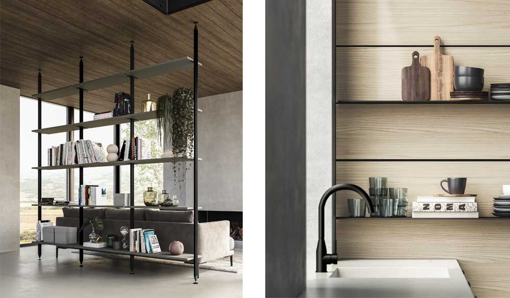 La libreria a soffitto, disponibile anche a parete, ha una struttura modulare in alluminio anodizzato nero con mensole scelte in melaminico monocolore Nebbia, la stessa finitura delle basi. La struttura modulare della boiserie, che unisce le basi sotto la finestra con le colonne, è in Synchroface olmo Paglia e accessoriata con mensole in alluminio Black. La zona cottura è tutta concentrata fra l’isola, con il piano a induzione, e le colonne retrostanti con i forni così da rendere facili i flussi di lavoro.