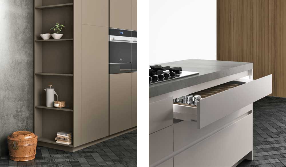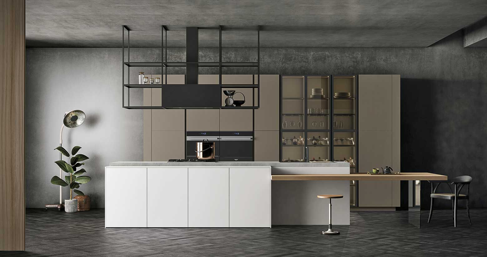 L’eleganza delle colonne in laccato opaco Camoscio fa da sfondo all’isola con la zona operativa, completa di lavaggio e fuochi, che domina l’intera composizione. Ha il top in laminato Cemento Polvere, contrapposto al piano snack ad altezza tavolo con supporto in vetro.