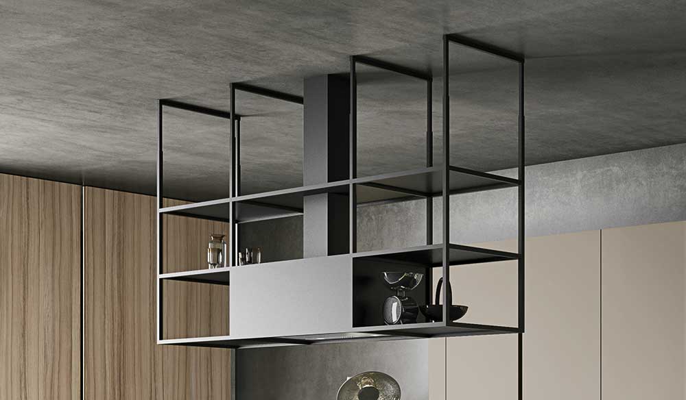 La versatile struttura in alluminio tubolare è a sezione quadrata, verniciata in nero e con ripiani in vetro. Qui è usata a soffitto con cappa integrata, utile anche per riporre pentole e appendere utensili. Le colonne terminano con il pratico vano laterale a giorno per sfruttare tutto lo spazio e riporre oggetti decorativi o d’uso quotidiano. Le basi dell’isola hanno il sistema d’apertura con gola piatta e come maniglia un profilo di metallo in testa all’anta, disponibile in bianco, alluminio o nero.