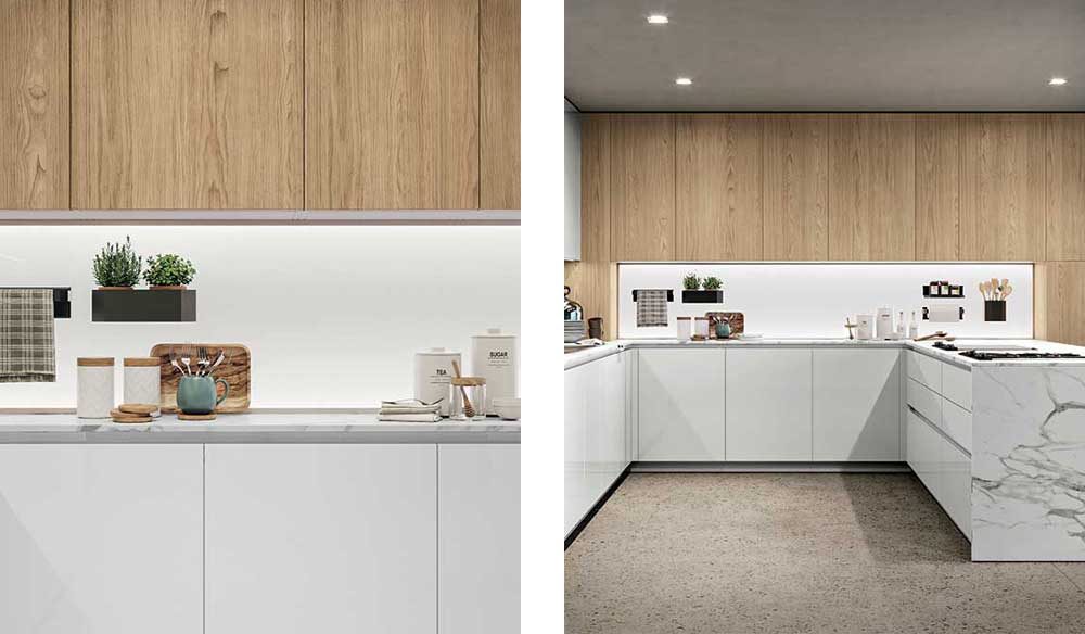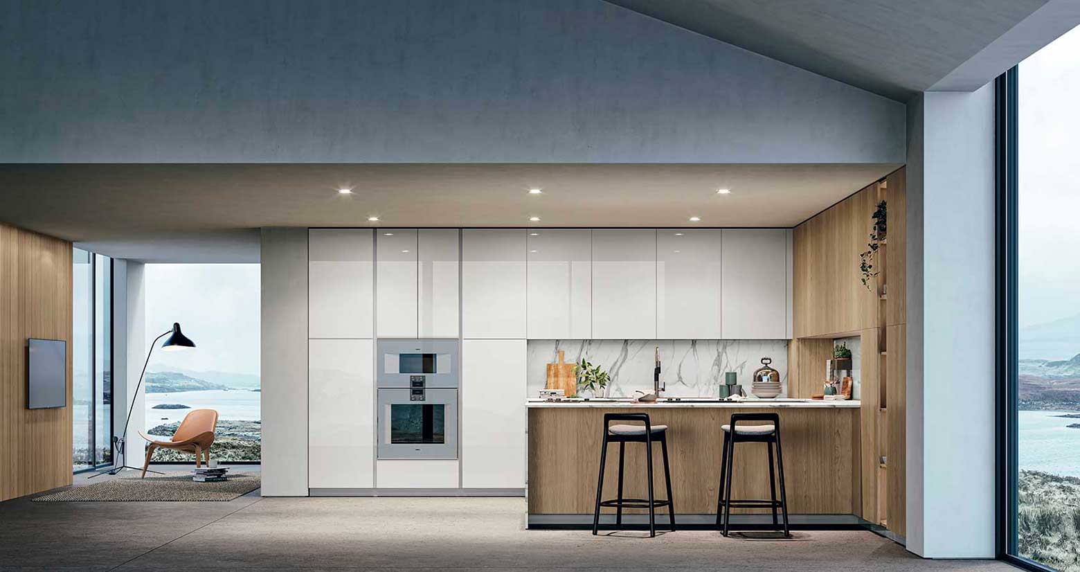 I toni candidi sono un filo conduttore: basi in lucido XGloss Bianco, top e fianco dell’area snack in laminato HPL Statuario Liscio e soprattutto schienale luminoso, incorniciato da pensili e colonne in Synchroface rovere dogato Sesamo. È retroilluminato e magnetico con accessori calamita (contenitori, porta-rotolo, porta-mestoli…). La cucina a golfo si apre con colonne e pensili incassati in un’ampia nicchia. La prima colonna è attrezzata con tre cestoni, comodi da estrarre, profondi e capienti, e seguita dal blocco dei forni americani da 30 pollici (cm 76,2). Per cucinare c’è anche il sistema modulare Domino, incassato nel top, perfetto per creare un piano cottura personalizzato.