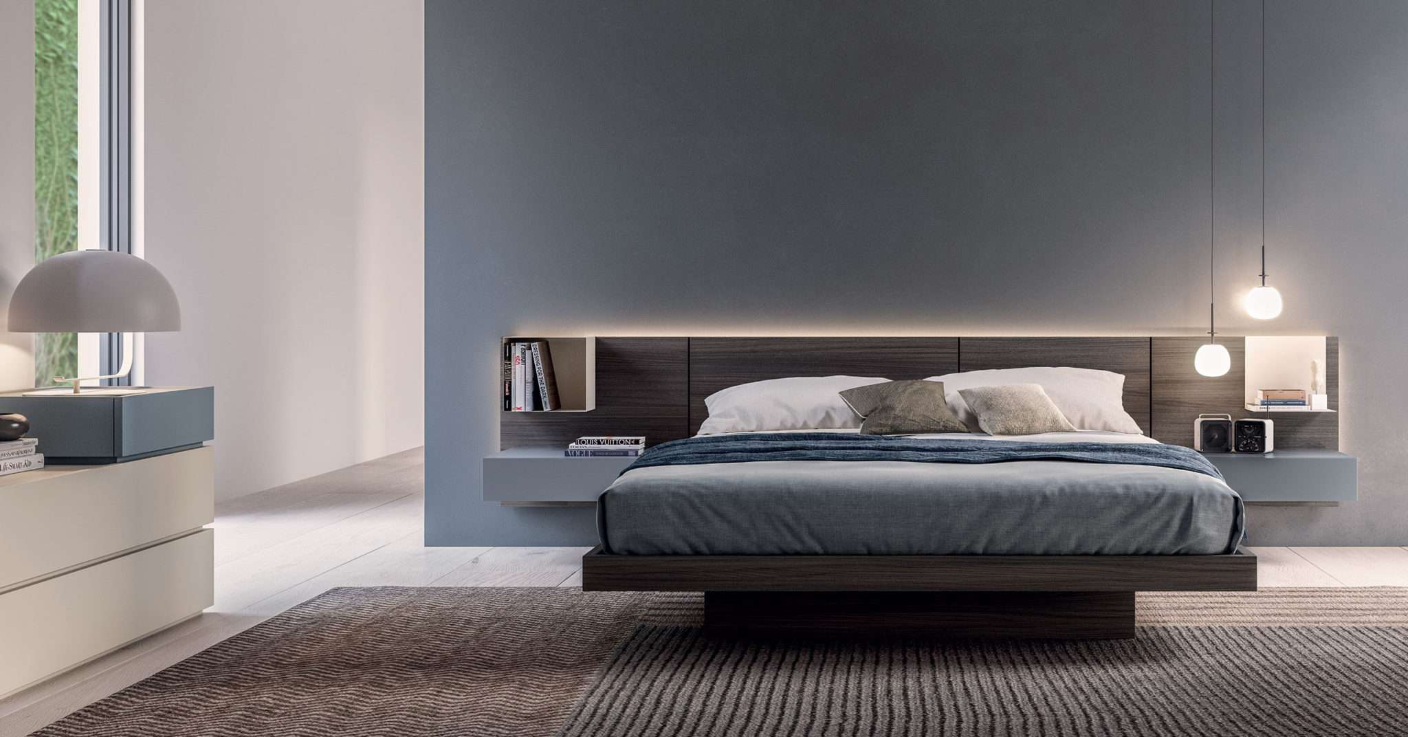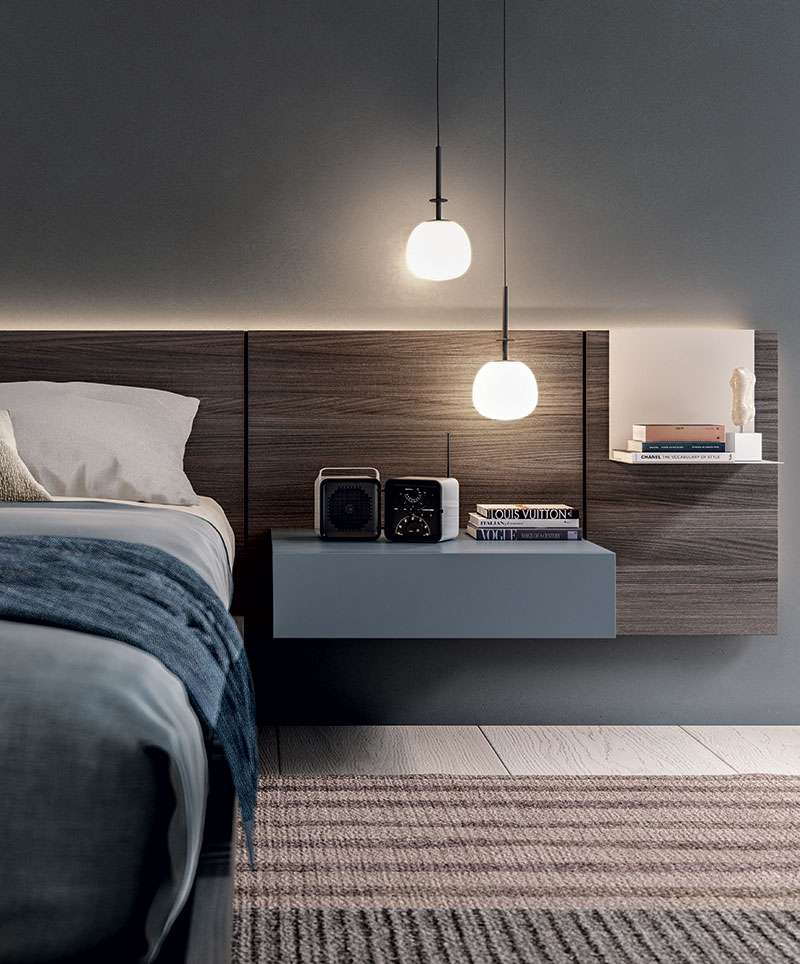 Testata, giroletto e box contenitore Materico Olmo Scuro. Cassetti laccato opaco Alta Marea. Contenitori movibili in lamiera verniciato Bianco. Illuminazione led. Gallia / Comò