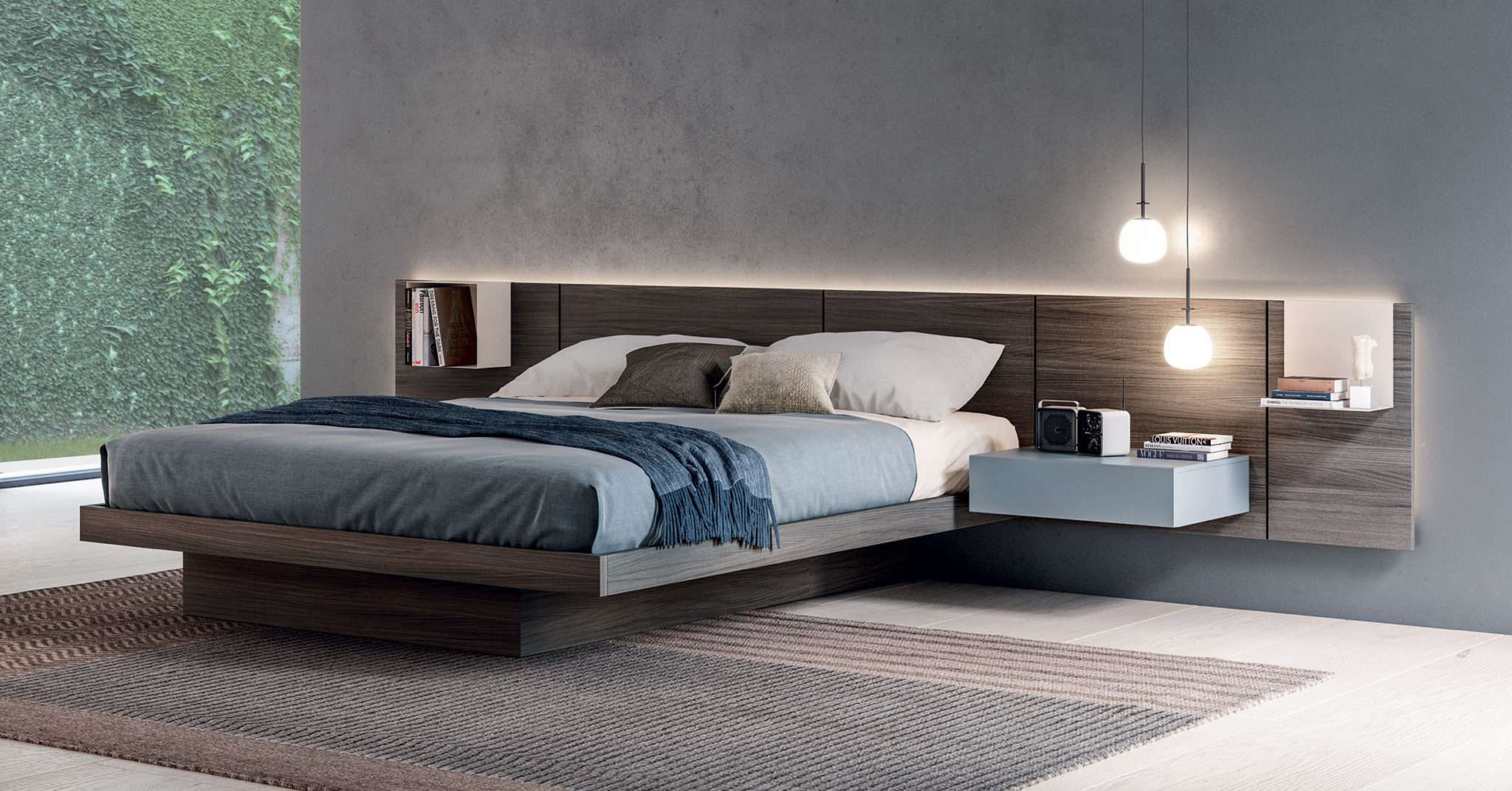 LA BASE DI MIRANDA È ARRETRATA RISPETTO AL PERIMETRO DEL LETTO PER CREARE UN IMPATTO VISIVO DI LEGGEREZZA E SOSPENSIONE, ANCHE NELLA VERSIONE CON CONTENITORE.