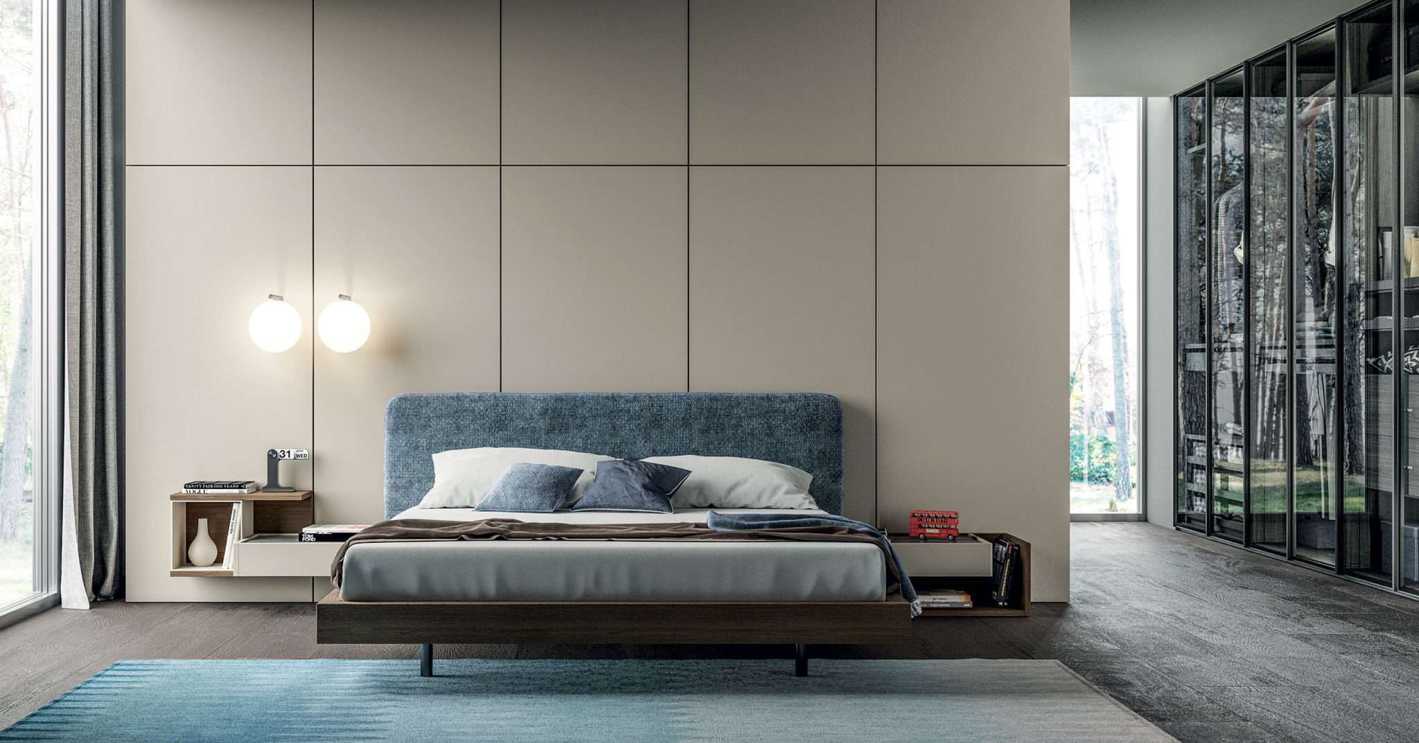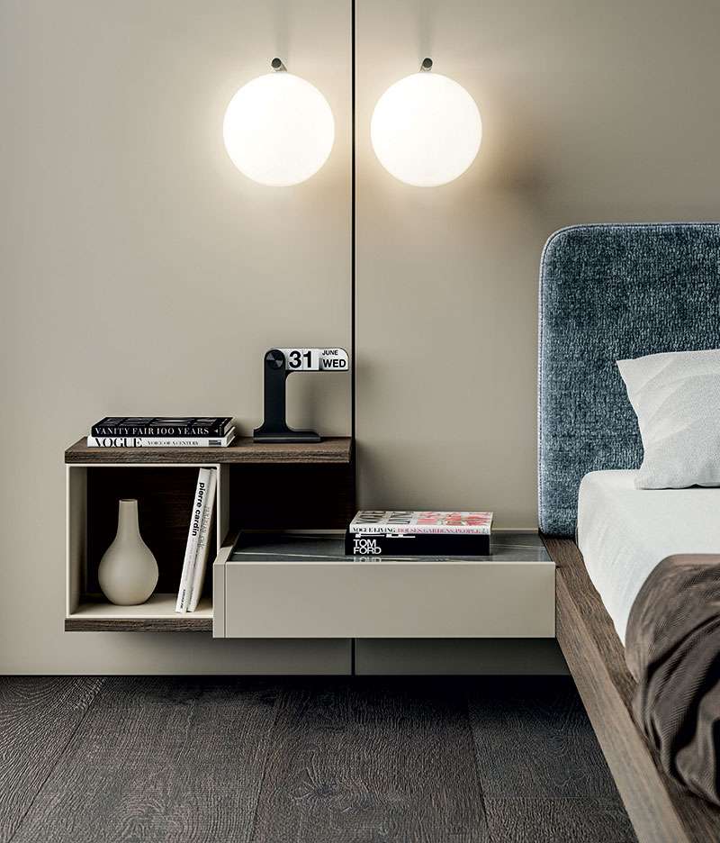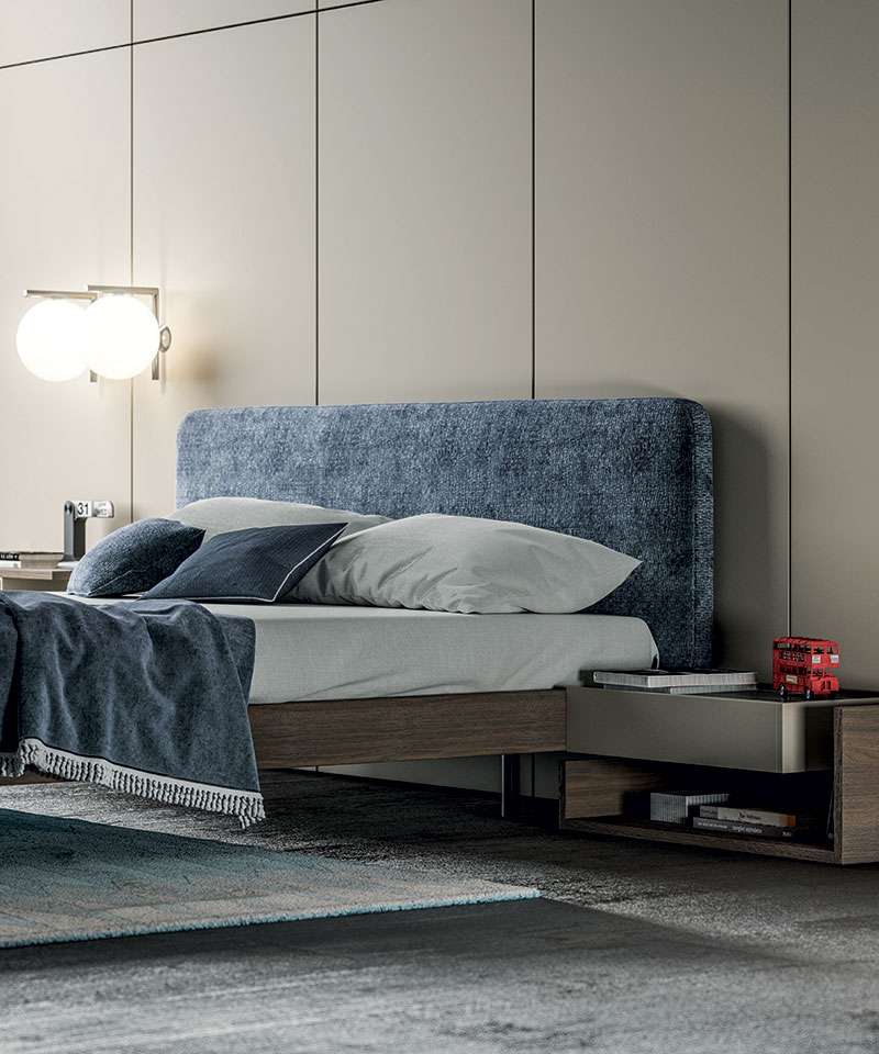 UN LETTO DALLE DIVERSE POSSIBILITÀ COMPOSITIVE. TRE TIPOLOGIE DI COMODINI INTEGRATI PER DIFFERENTI ESIGENZE ESTETICHE E CONTENITIVE.
