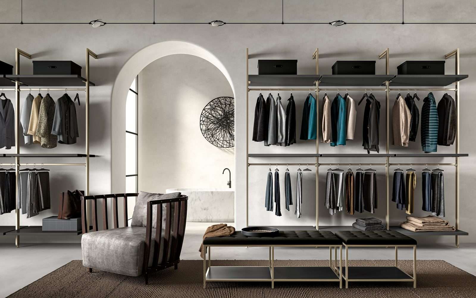 Cabina con montanti a soffitto o a muro in due profondità. Una linea adatta anche per i negozi