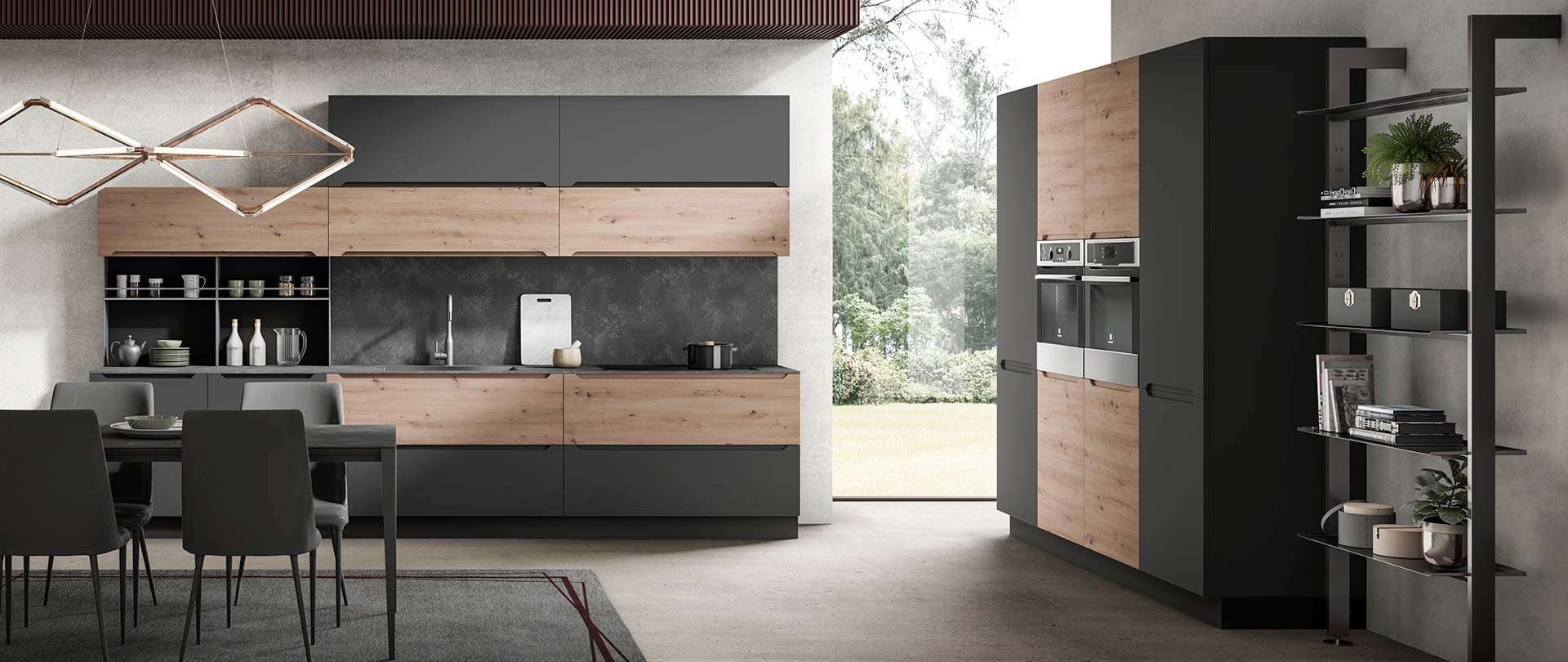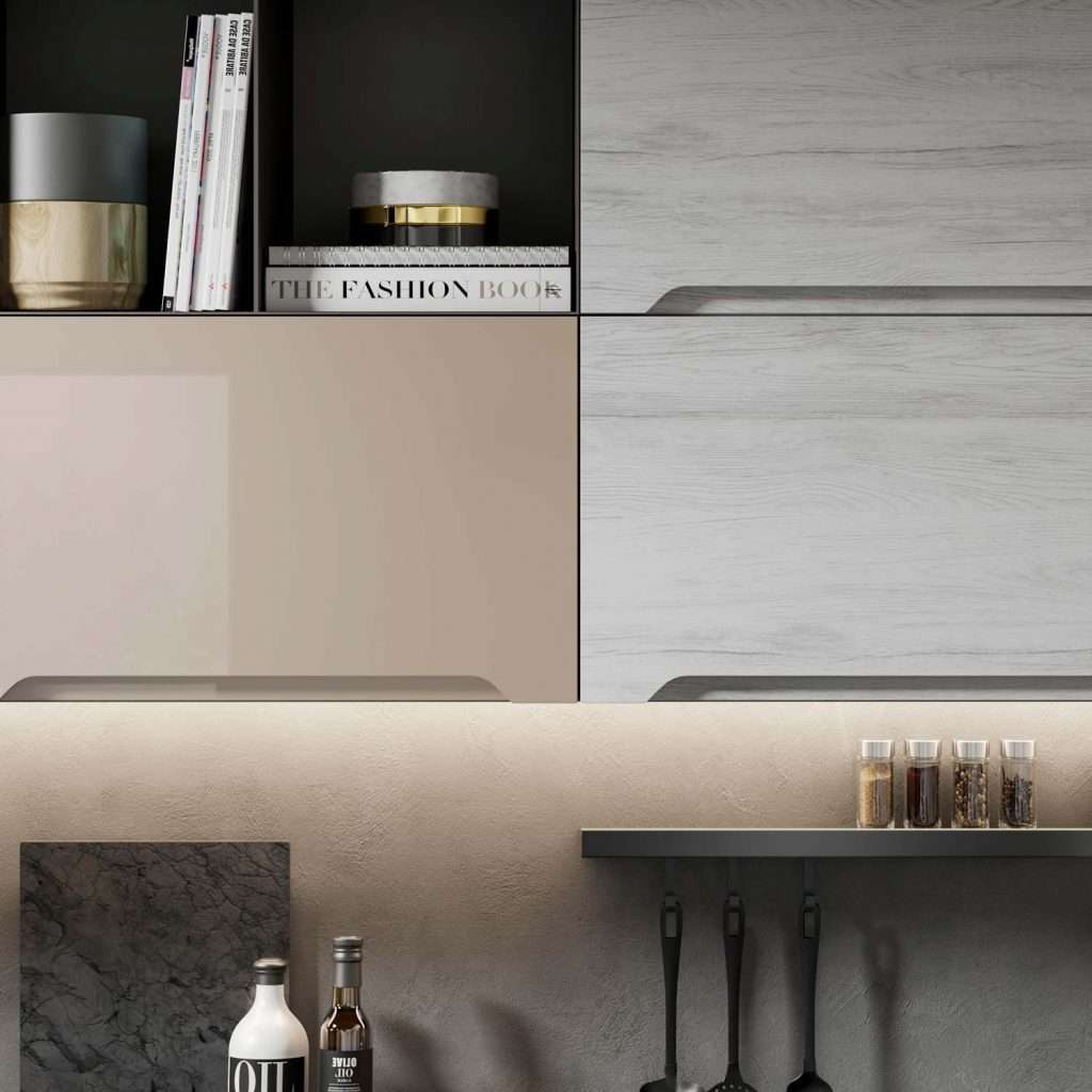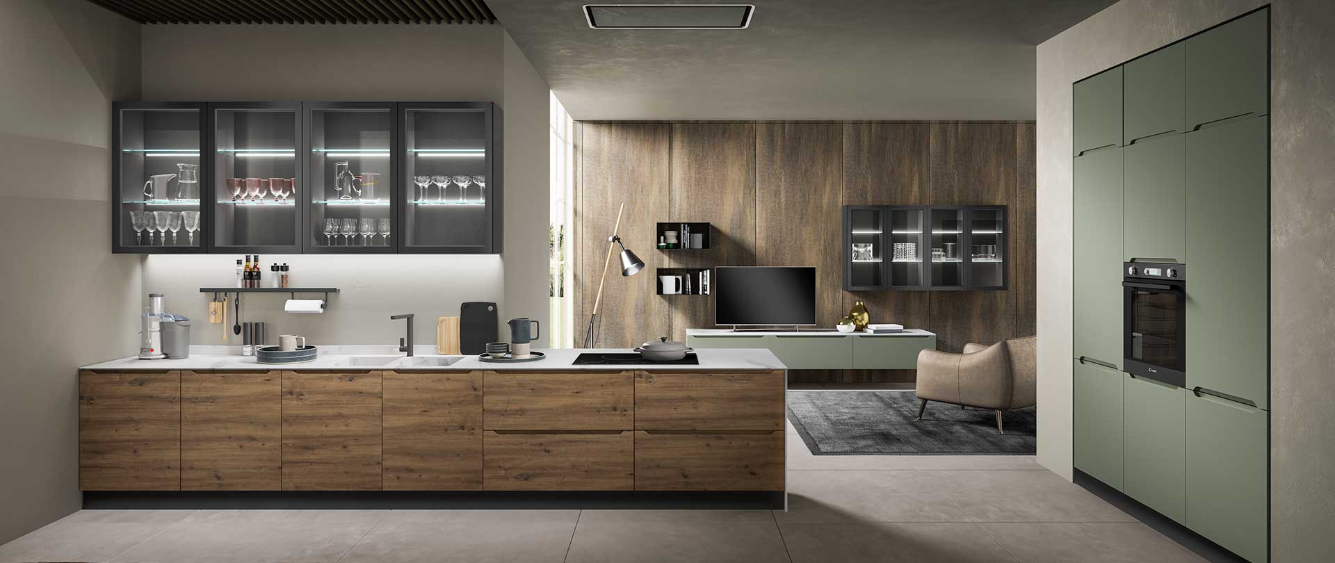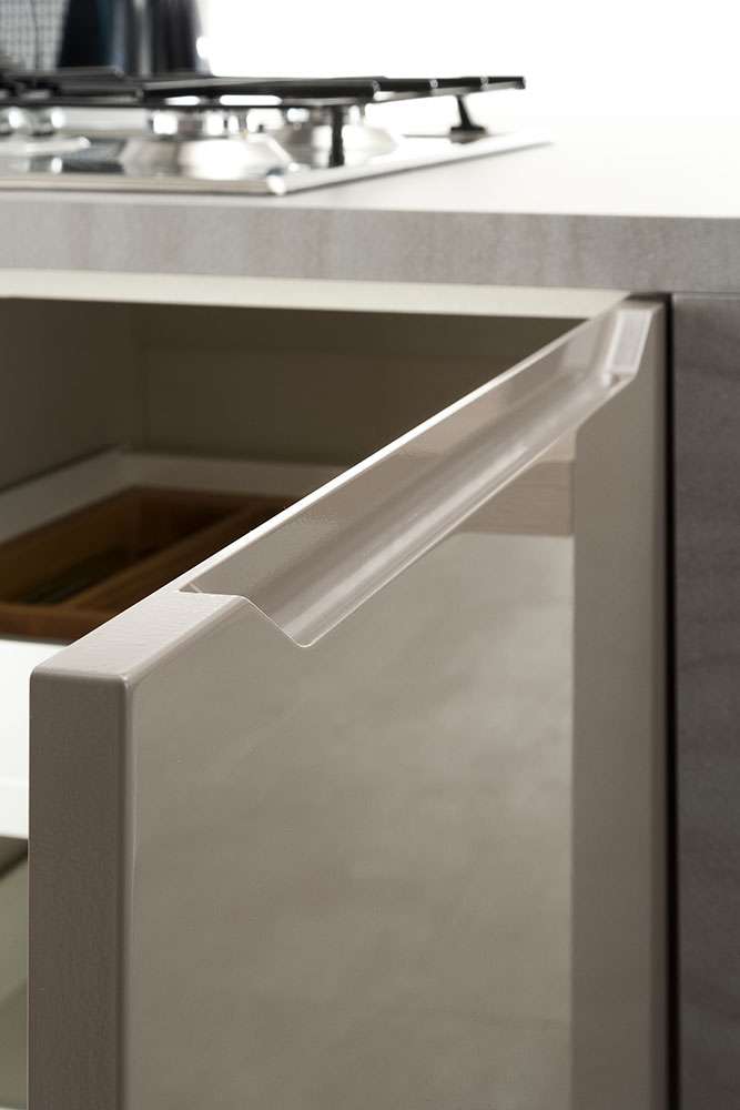Frutto di un progetto sartoriale, la cucina Carima si impone con la sua particolare maniglia integrata all’anta, proposta nelle finiture lucide, opache e effetto legno.