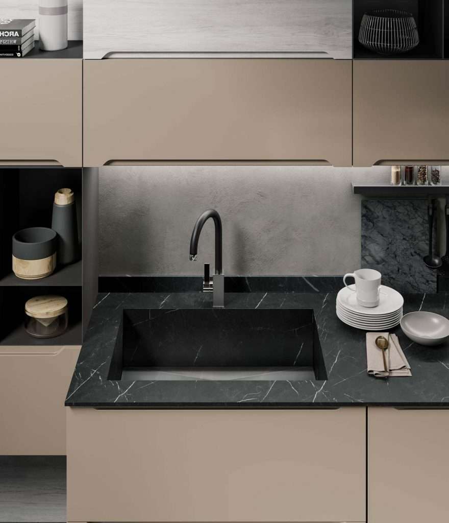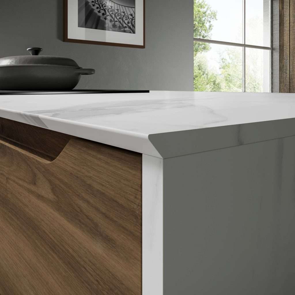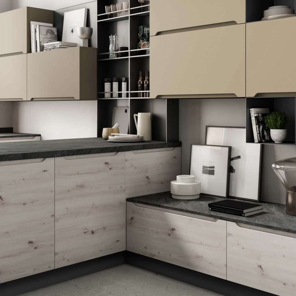 Frutto di un progetto sartoriale, la cucina Carima si impone con la sua particolare maniglia integrata all’anta, proposta nelle finiture lucide, opache e effetto legno.