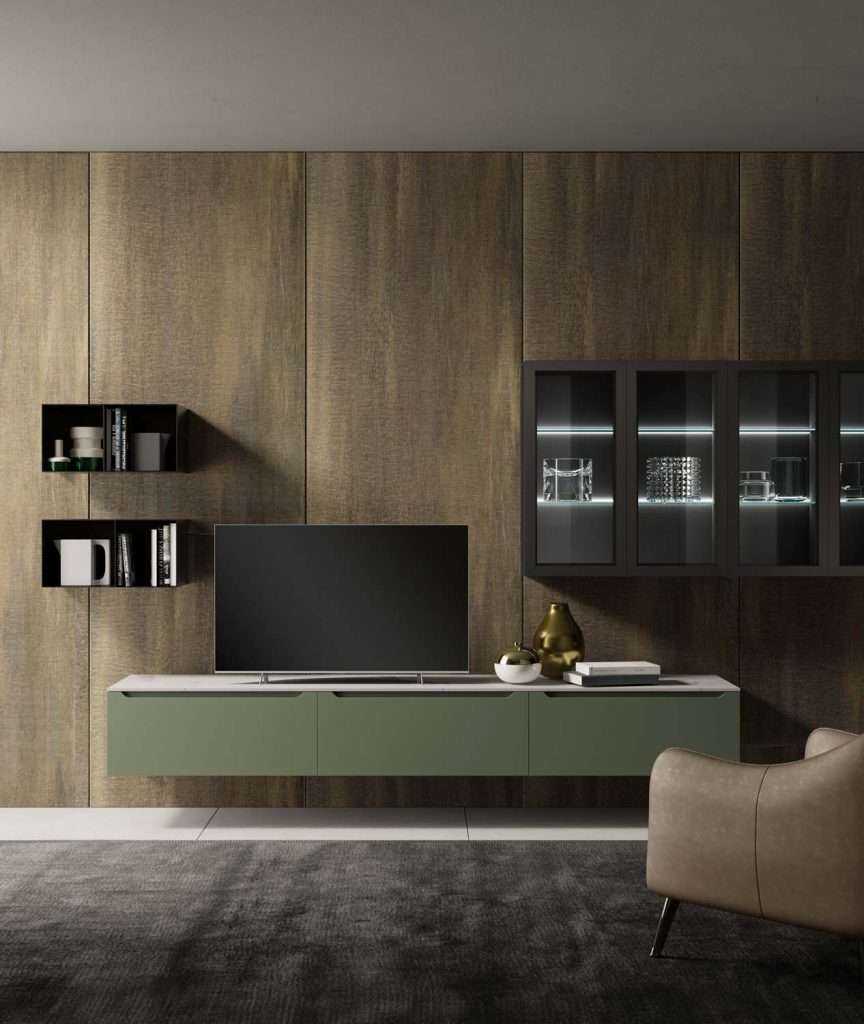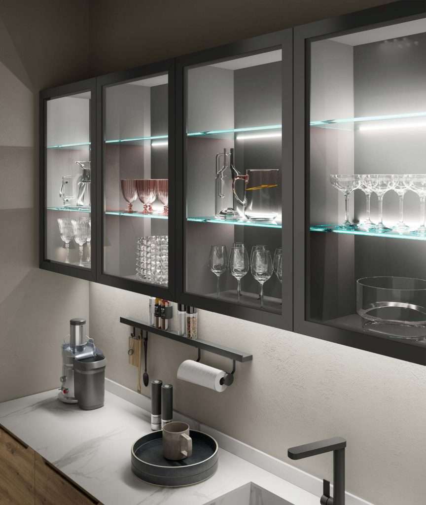 Molteplici le possibilità di personalizzazione delle finiture e delle configurazioni, dal piano in rovere del bancone al top in quarzo della cucina, dalle colonne con cestelli completamente estraibili e girevoli alle mensole luminose in vetro.