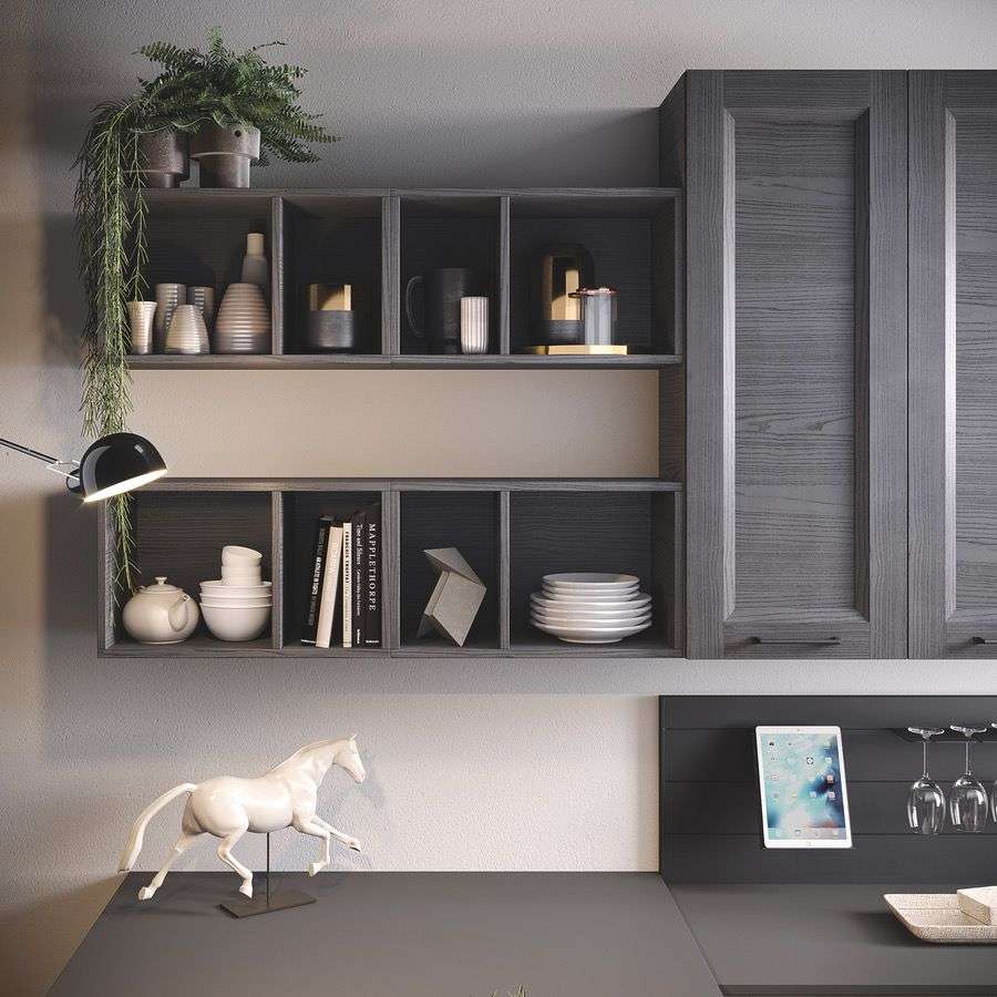 L’altissima modularità di Gea si esprime anche nei moduli living sospesi e negli elementi a giorno, liberi oppure installati sullo schienale boiserie con doghe verticali, nella stessa essenza dei frontali.