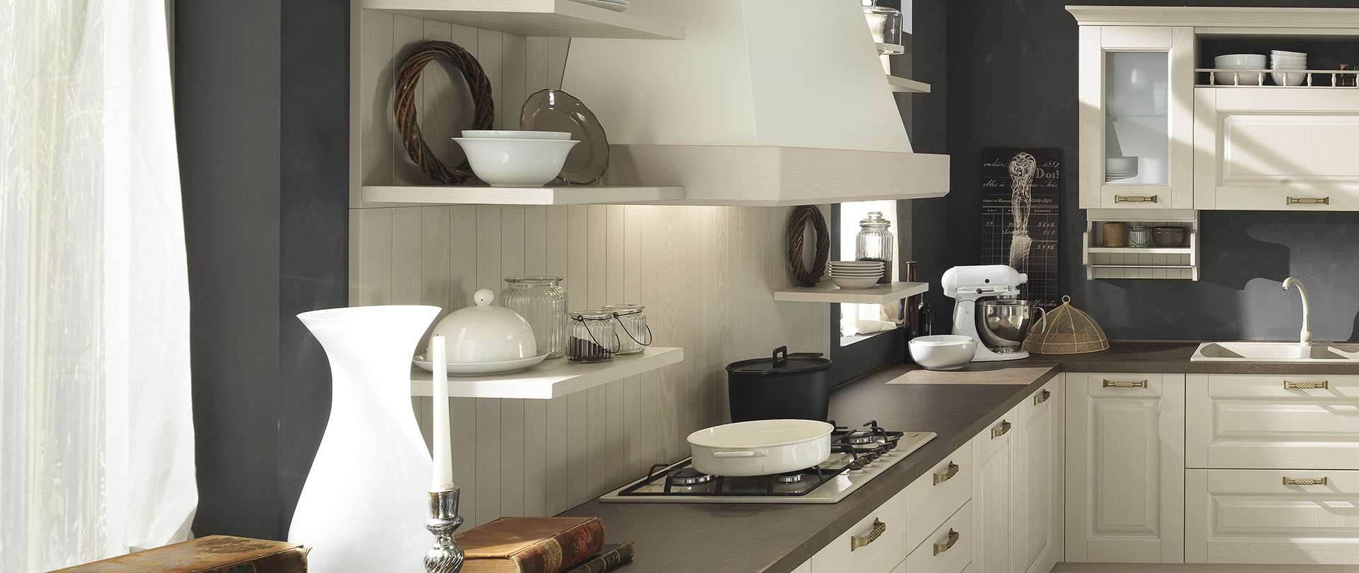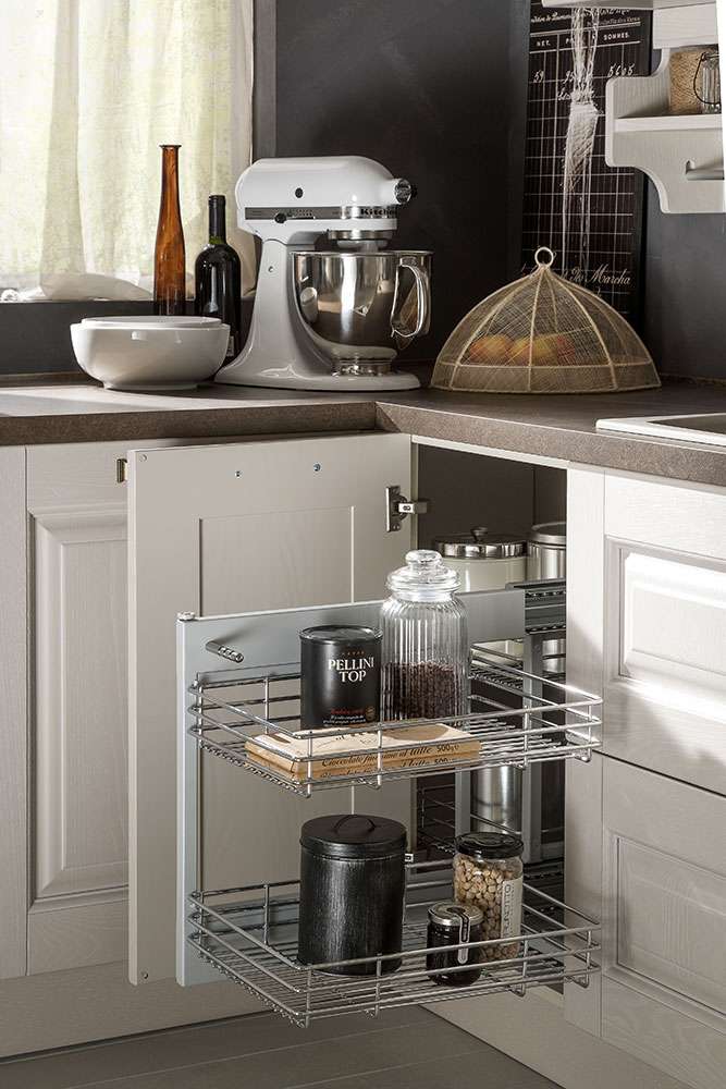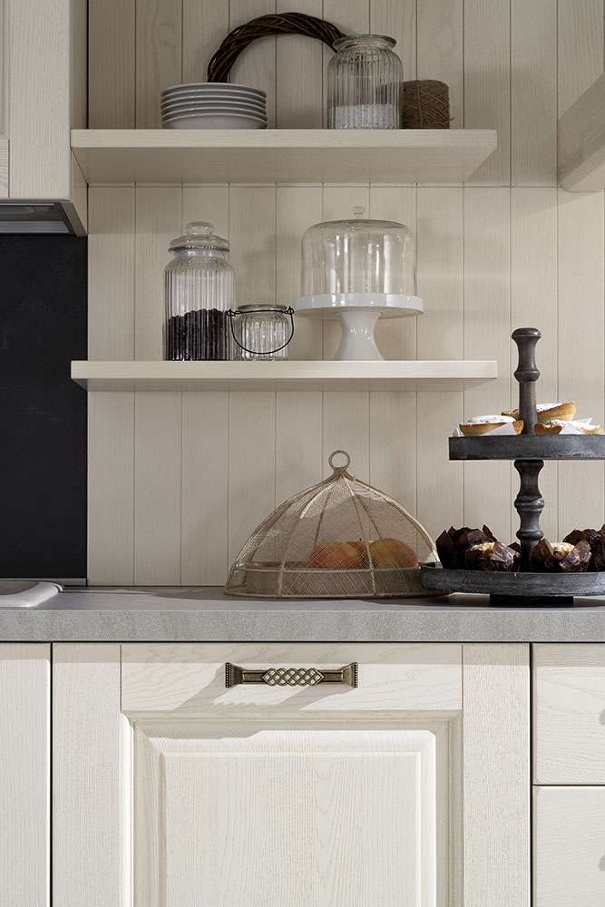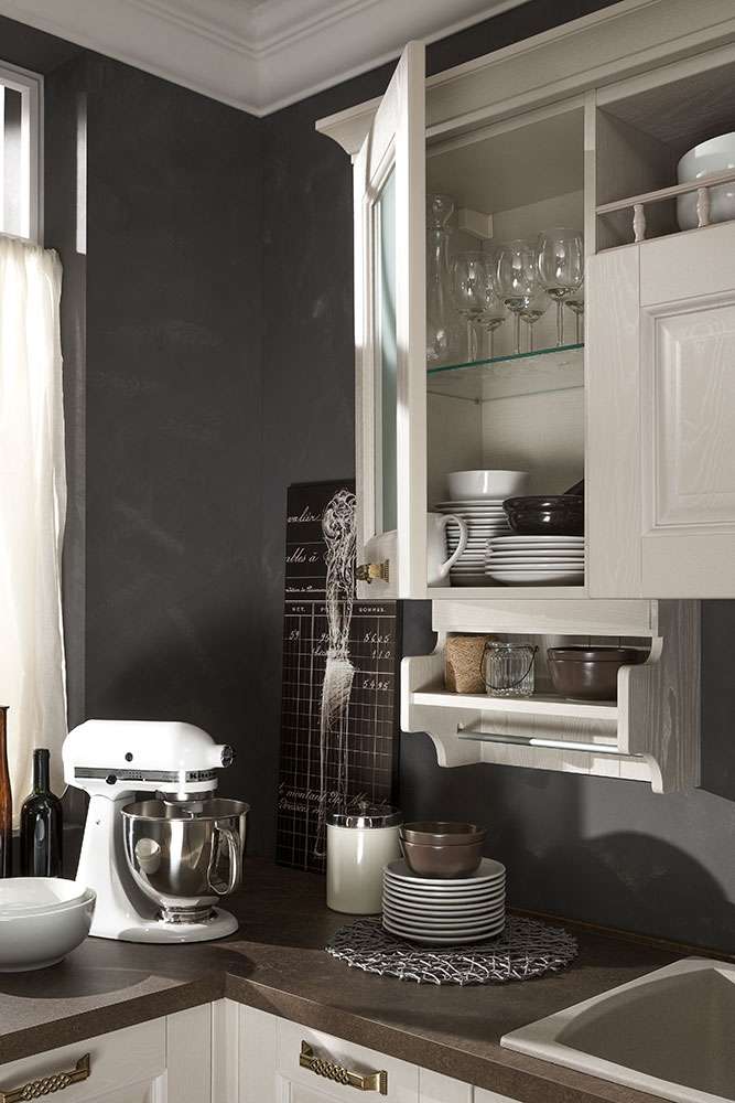 Molteplici i dettagli che arricchiscono la cucina Telma: pensili sospesi, boiserie, sottopensili e barre porta-utensili, colonnine intarsiate, maniglie in bronzo antico, colonne forno, mensole in legno, cestelli girevoli rendono il progetto Telma elegante, esclusivo, molto curato. Il tutto completamente personalizzabile grazie a un’assortita gamma di accessori per le configurazioni interne di basi e pensili.