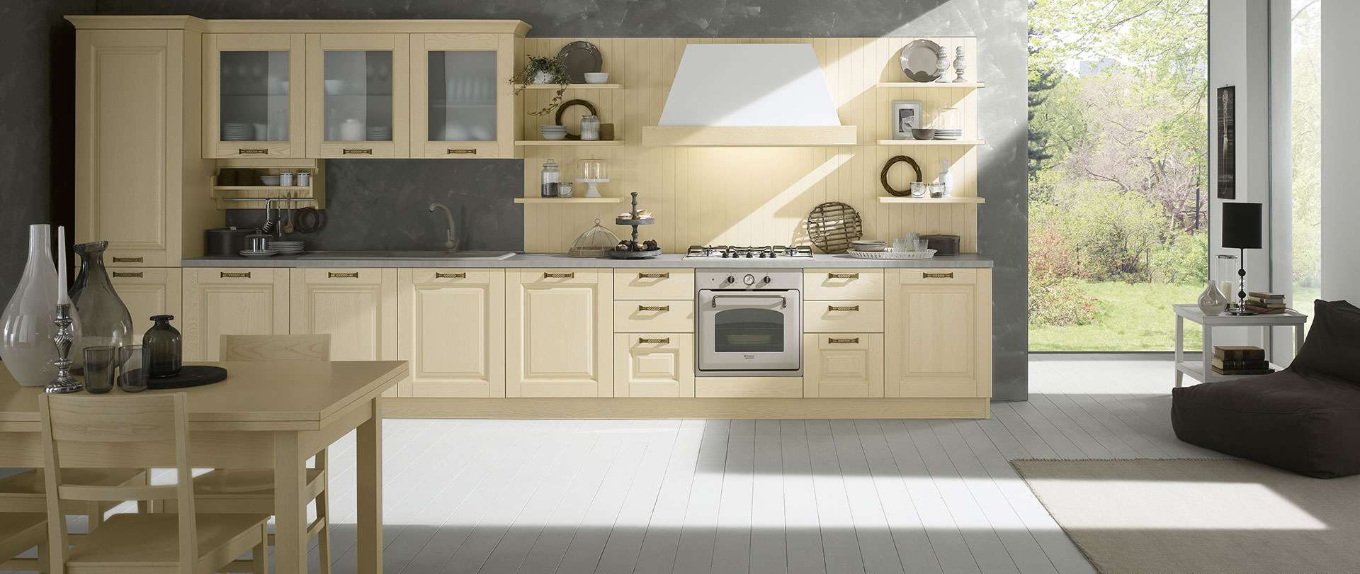 Cucina in legno massello di frassino, Telma è un programma componibile versatile, di alta qualità, studiato nei minimi particolari. Le ante, di alta manifattura, sono di spessore 24 mm e presentano telaio e pannello centrale in legno massello di frassino.