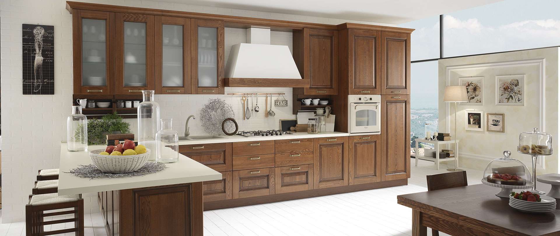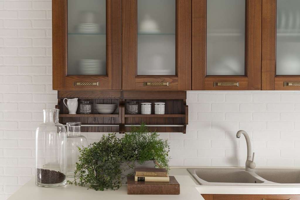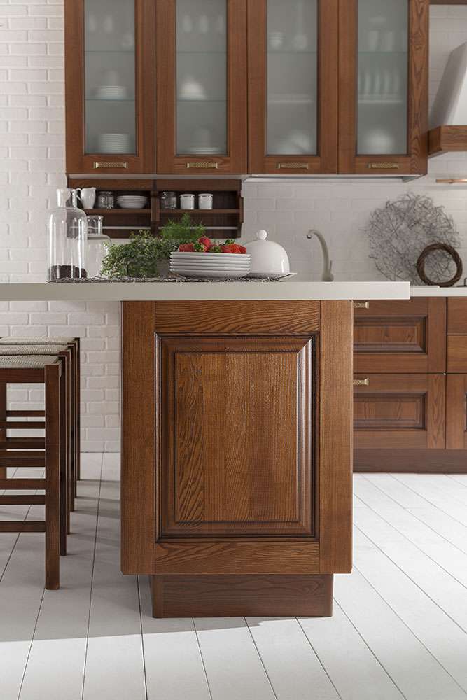 Il colore noce, realizzato con tinta a solvente, conferisce alla cucina un aspetto caldo e soft, ideale per chi predilige il tradizionale arredo di stile classico.