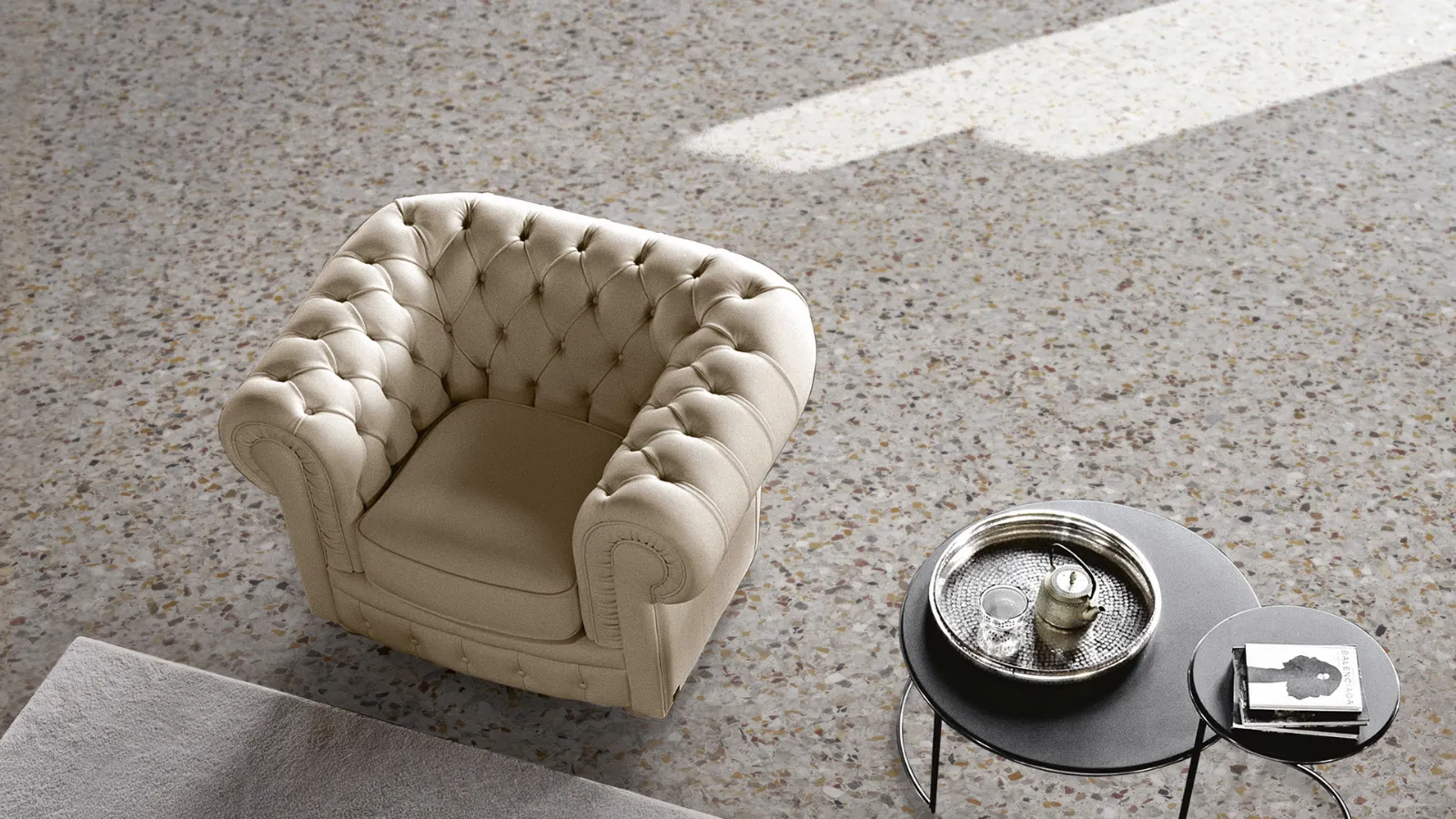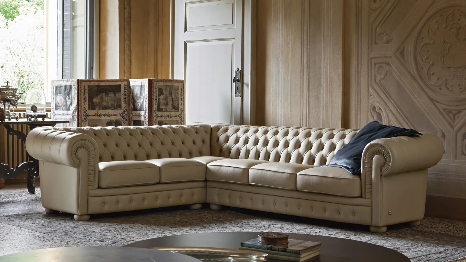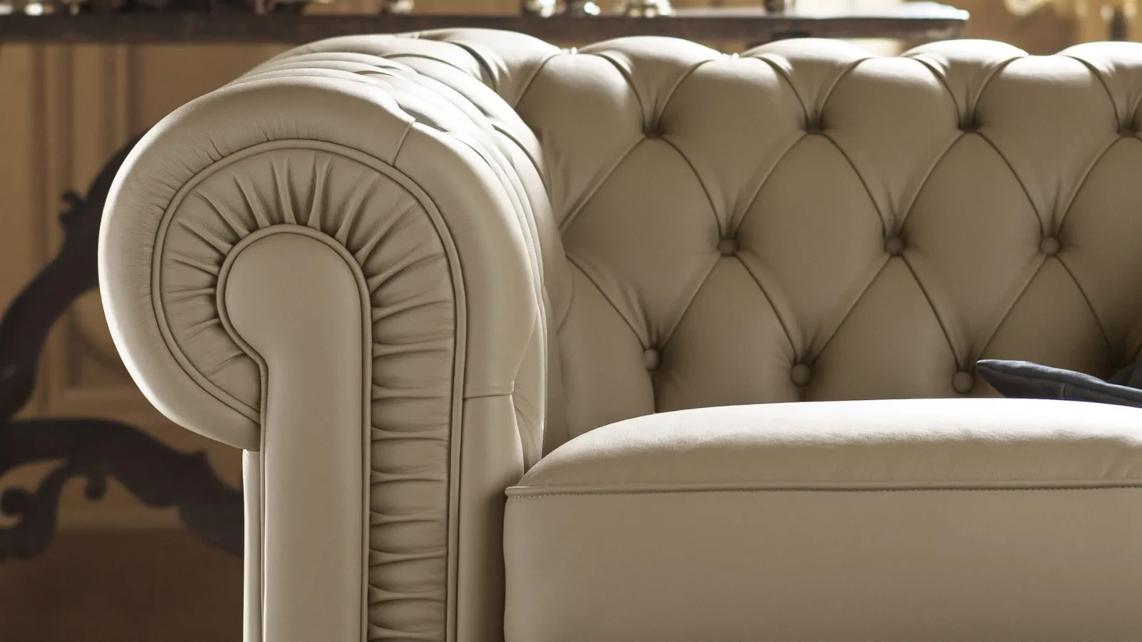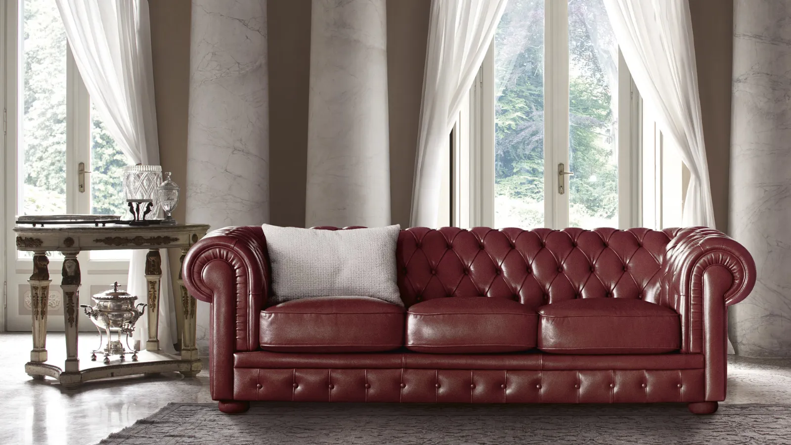 Un divano componibile in pelle, dalle linee classiche ed eleganti, caratterizzato dalla lavorazione a capitonné (anche detto pelle lavorata con bottoni) e dai braccioli arrotondati che conferiscono una grande armonia delle forme, propria dei divani classici di tipo Chesterfield.