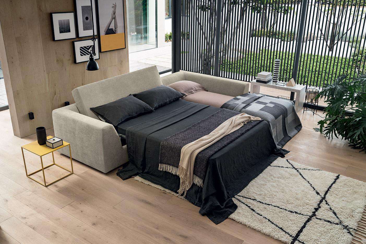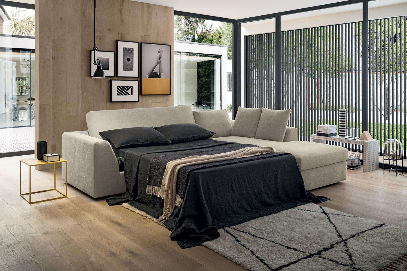 Linee pulite e solidità fanno di Aston un divano letto perfetto per arredare ambienti contemporanei curati ed eleganti. Con la sua ampia penisola è ideale per le serate in compagnia o per abbandonarsi al relax