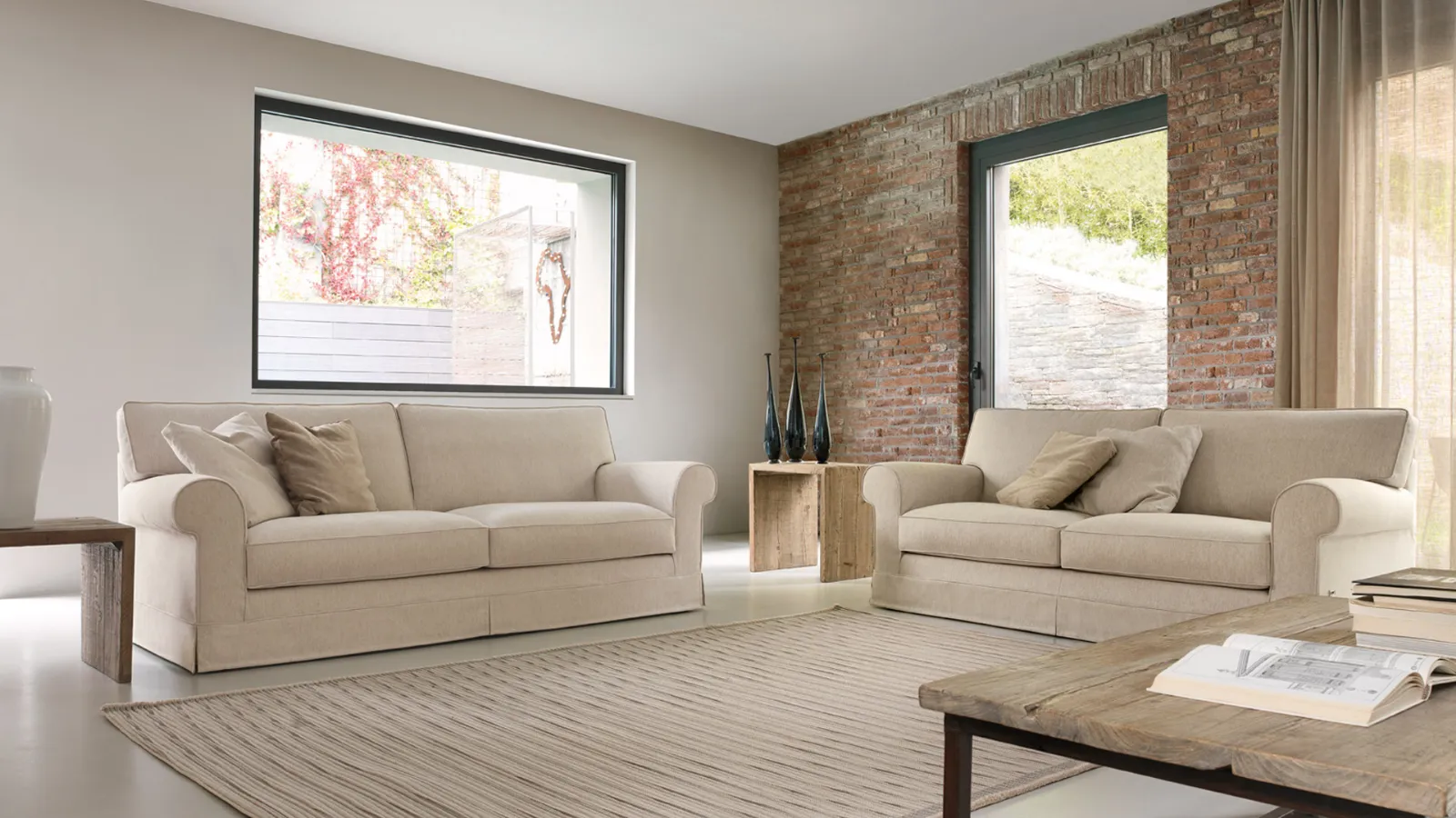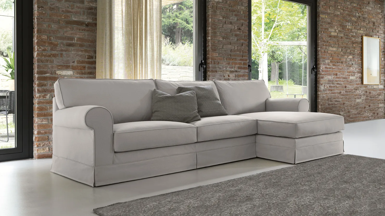 Il rivestimento può essere in tessuto, microfibra ed ecopelle con la possibilità di coordinare il tessuto della struttura a quello dei cuscini. Il tutto completamente sfoderabile.
