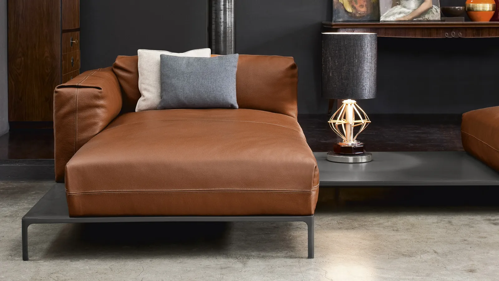 La base rialzata con struttura in metallo a vista e personalizzabile in varie colorazioni, arreda con leggerezza lasciando il giusto spazio alla cuscinatura, rifinita con una doppia cucitura ribattuta e caratterizzata dalla lavorazione a tasca, visibile nei braccioli come nei cuscini di seduta e schienale, sia nella versione in tessuto, sia in quella rivestita in pelle.