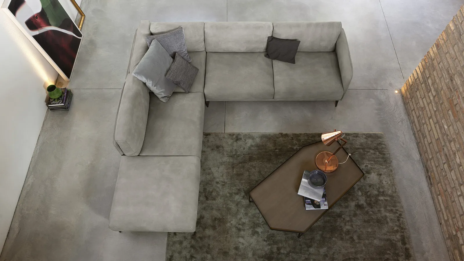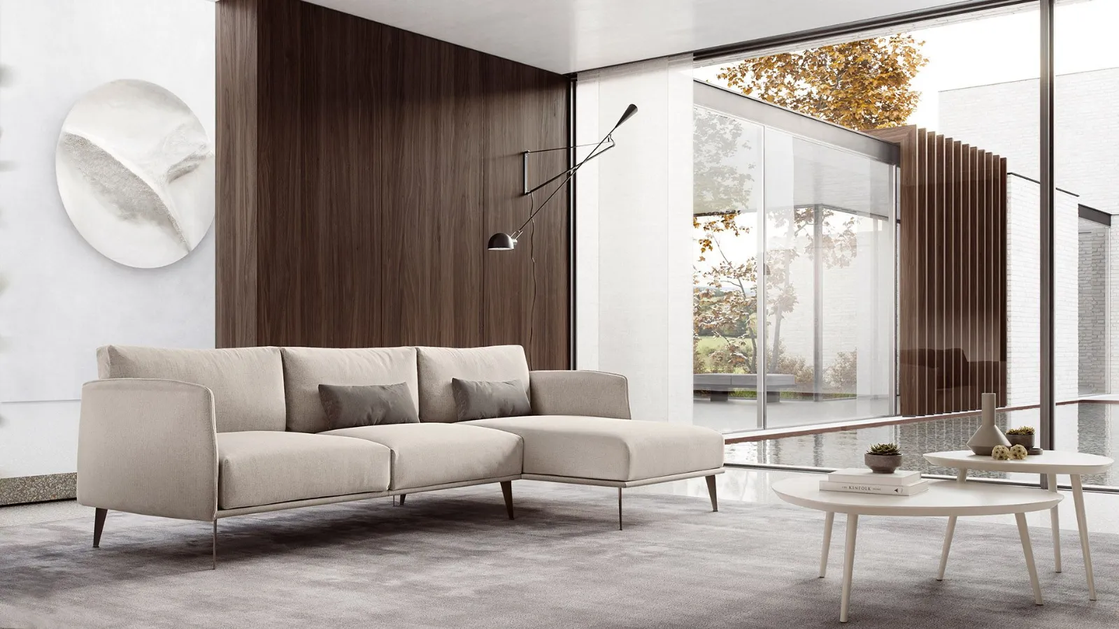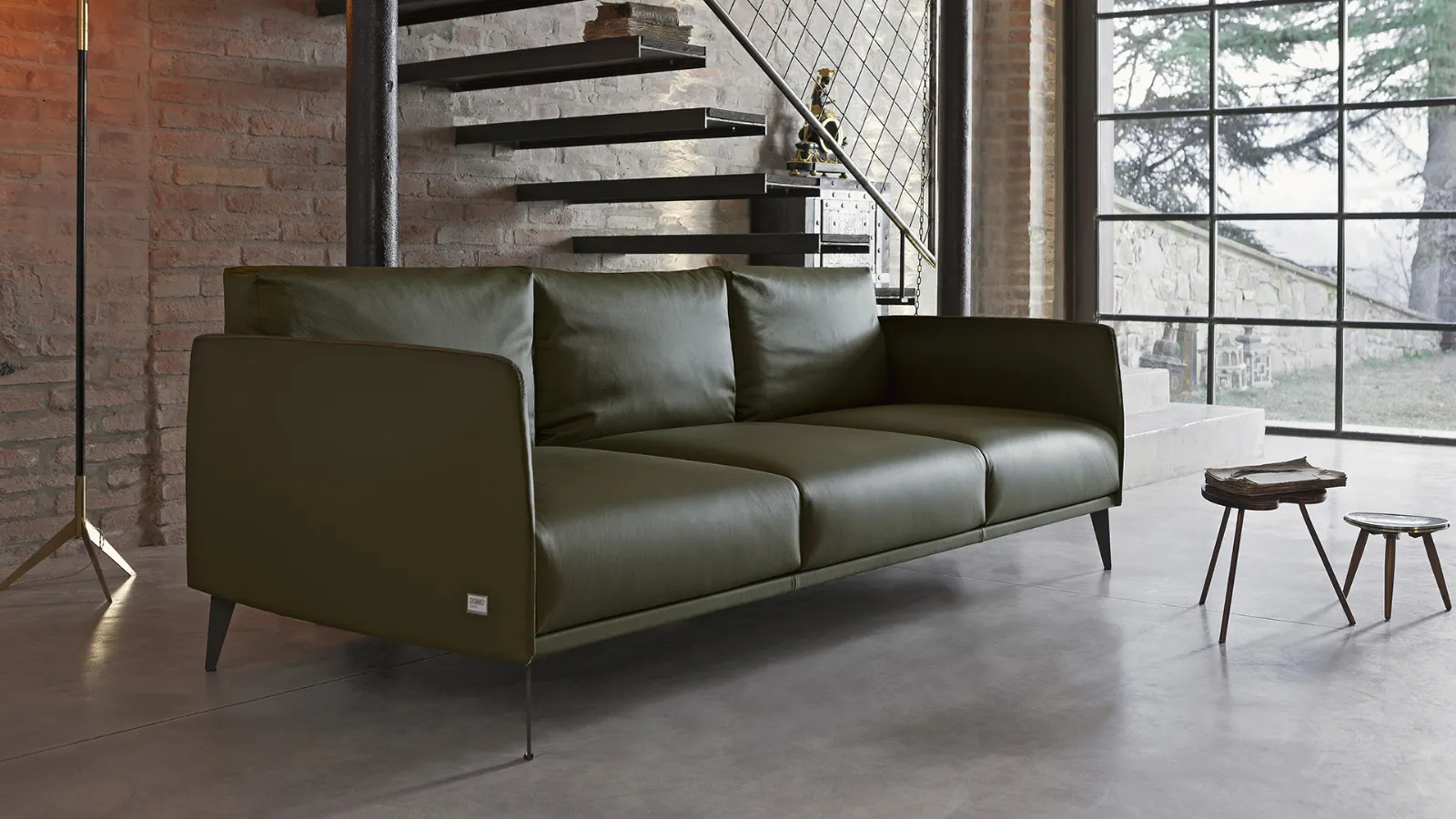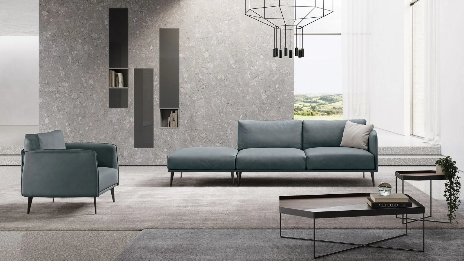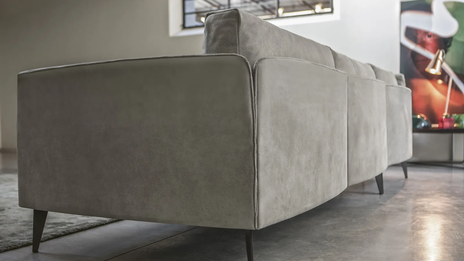 I piedi in acciaio, dalla forma affusolata e la base sollevata da terra alleggeriscono le forme del divano. I cuscini hanno uno stile contemporaneo e le imbottiture di seduta in poliuretano insieme allo schienale in misto piuma, garantiscono un sostegno ideale.