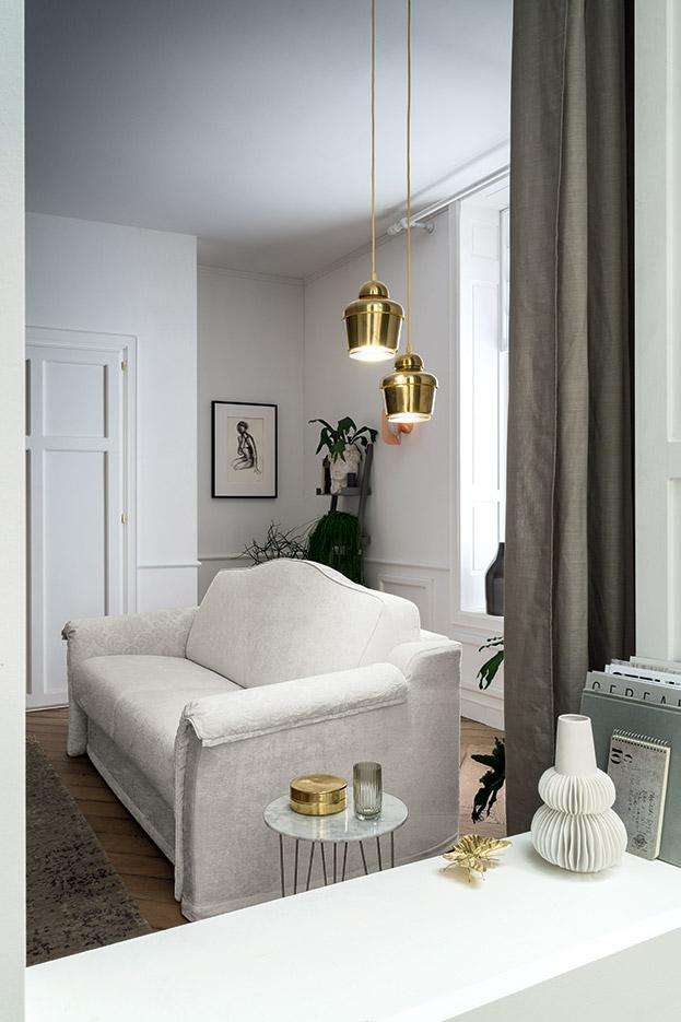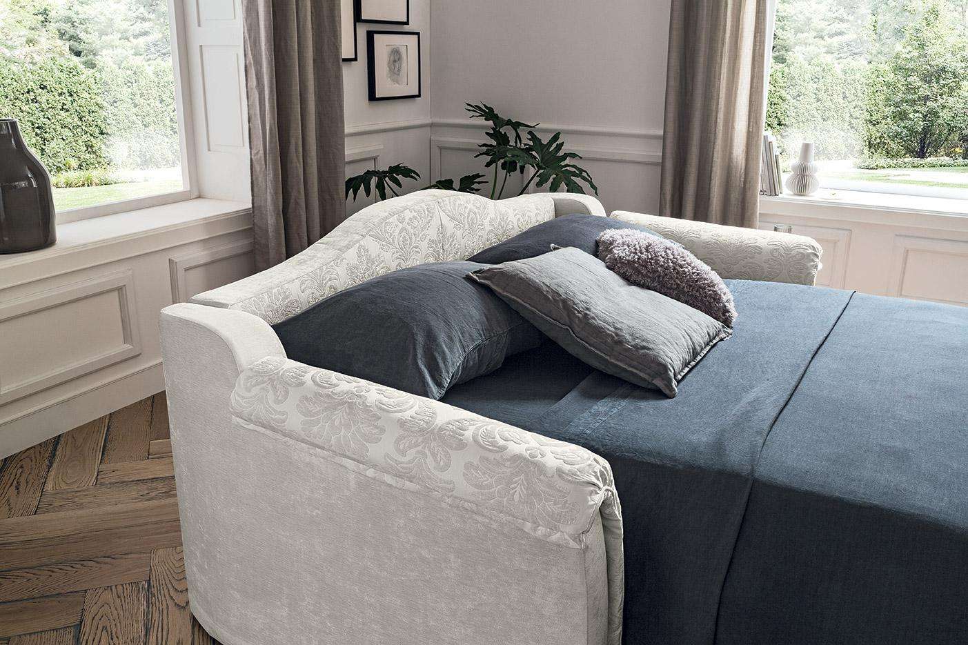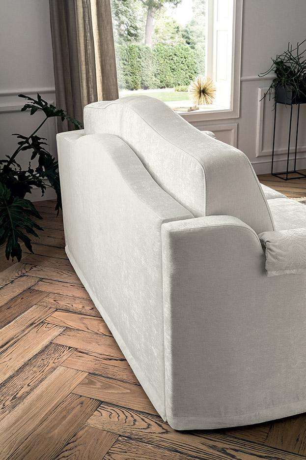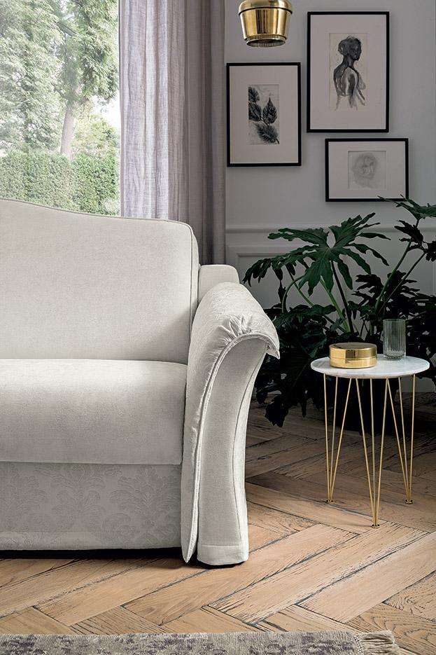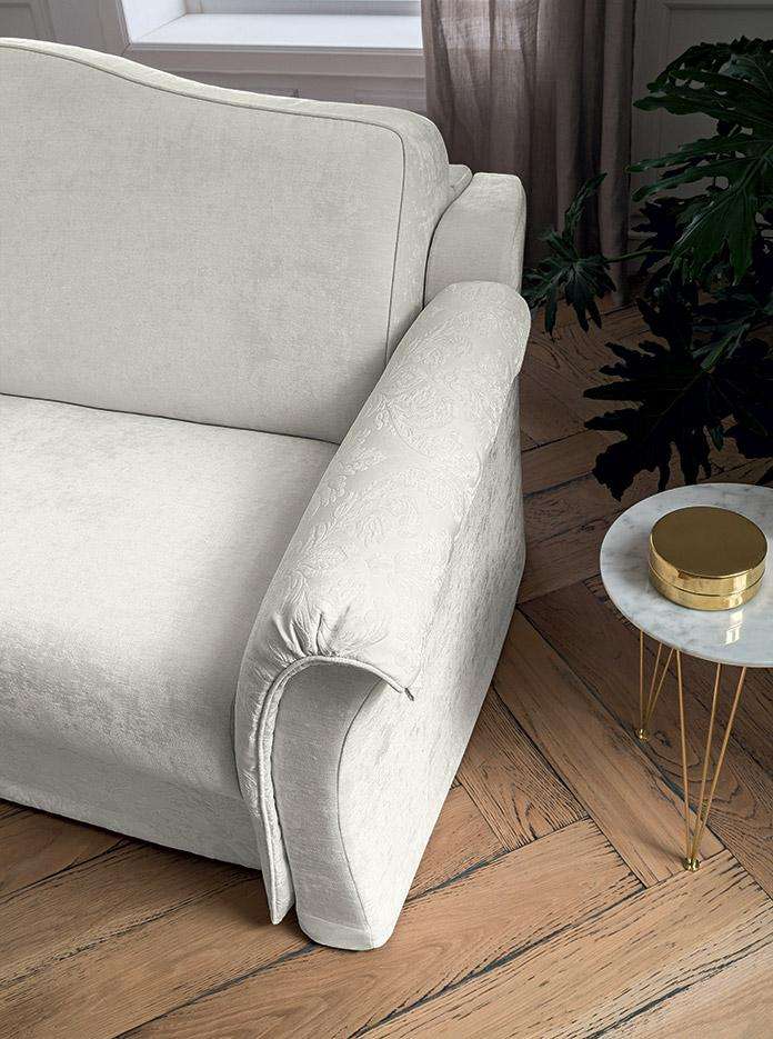 I braccioli girano verso l’esterno, la testata si alza in un gioco di curve al centro, mentre i tessuti offrono un delicato contrasto; in Tango non esistono dettagli banali.