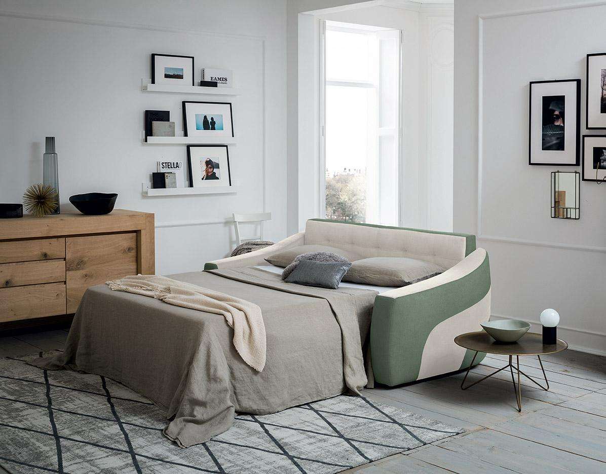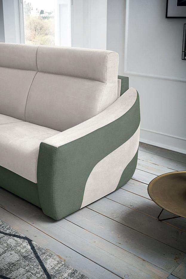 Alti cuscini poggiatesta, braccioli avvolgenti con una fantasia a curve, due colori e due tessuti: Xavier si fa ammirare per la sua intrigante unicità