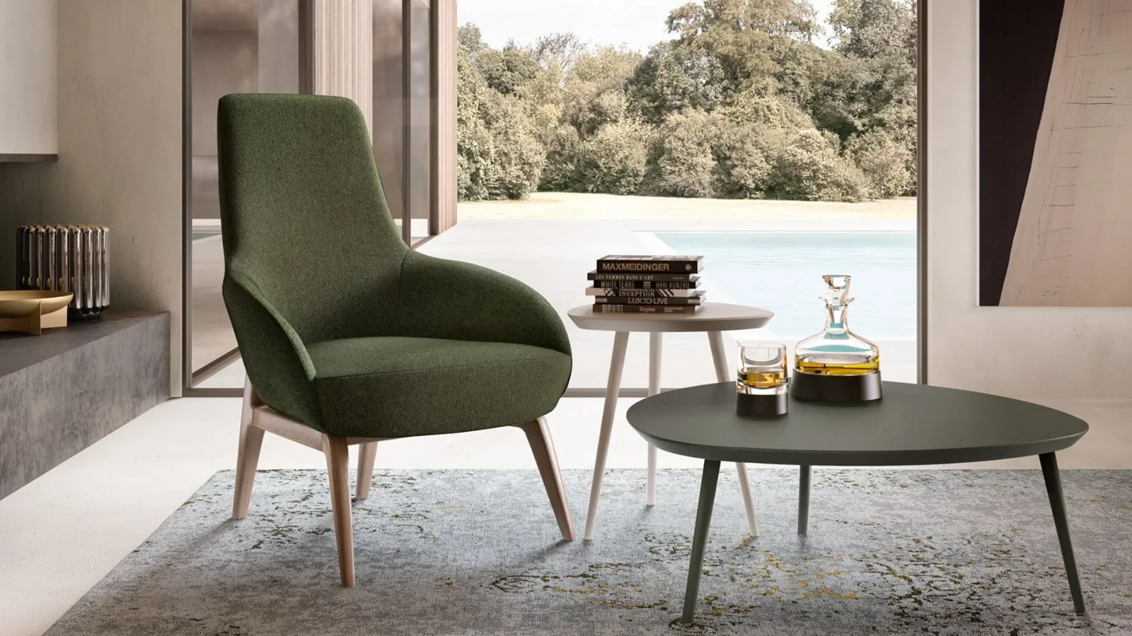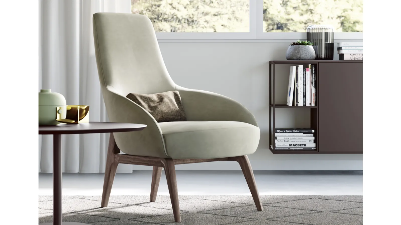 La sua forma avvolgente conferisce un ottimo comfort di seduta. Realizzata con struttura in legno e imbottitura in poliuretano espanso.