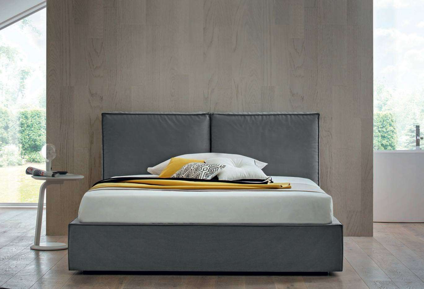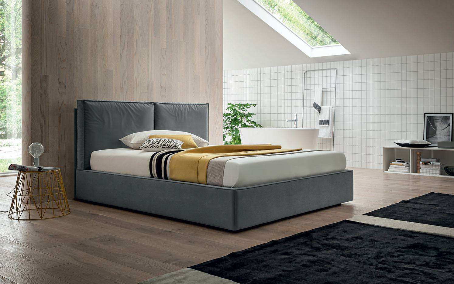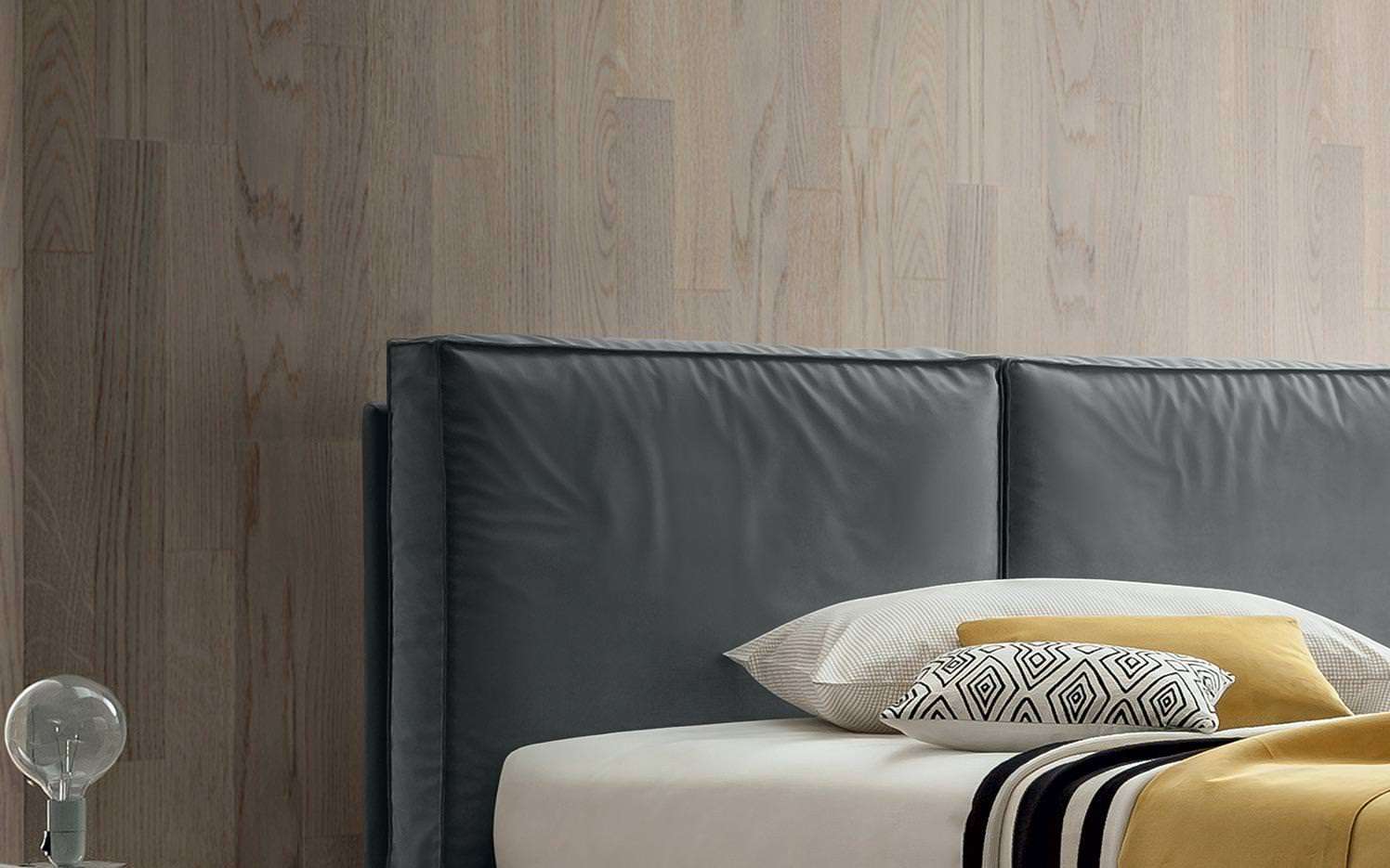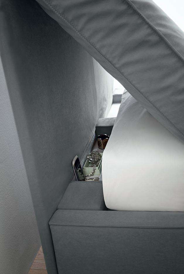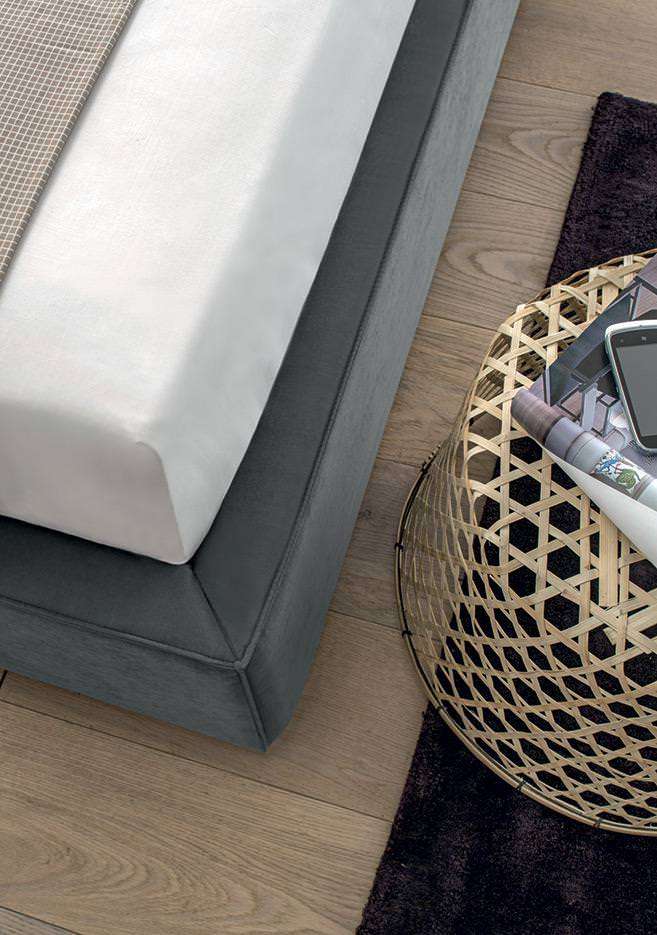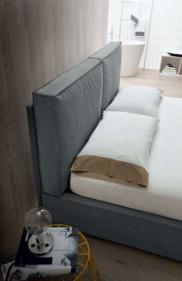 La cucitura con impatto estetico preciso e forte delinea i bordi dei cuscini e della struttura del letto, ricreando un dettaglio stilistico e sartoriale giovane e contemporaneo.