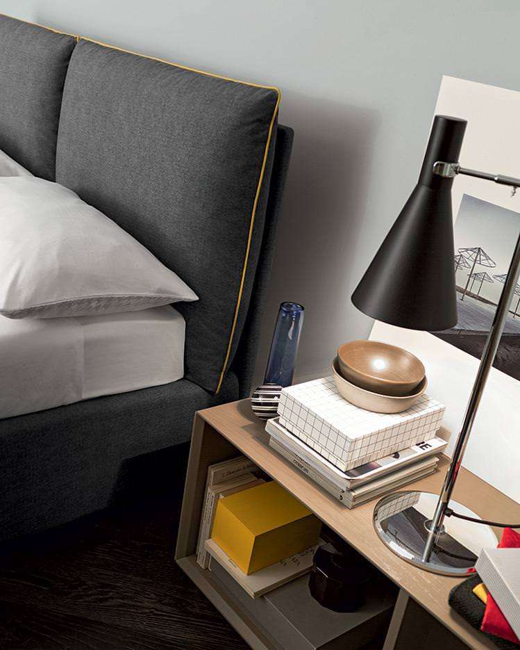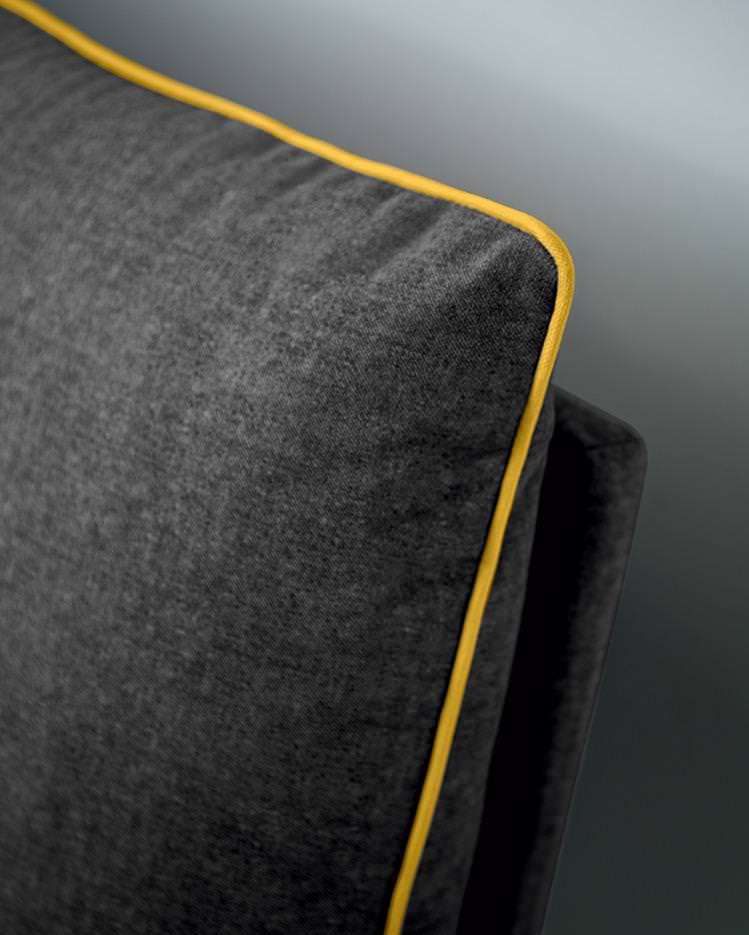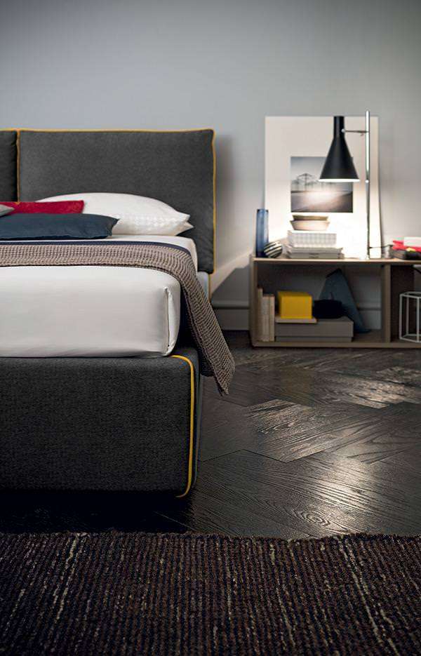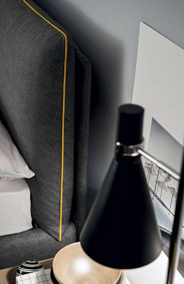 L’eleganza della semplicità. Luis ha un cordoncino in colore a contrasto sui bordi dei grandi cuscini della testiera e sugli angoli di giunzione ai piedi del giroletto, un particolare mai banale, che può completamente cambiare l’aspetto del nostro letto
