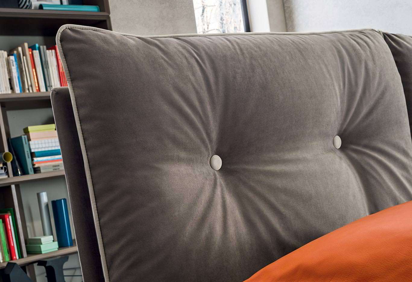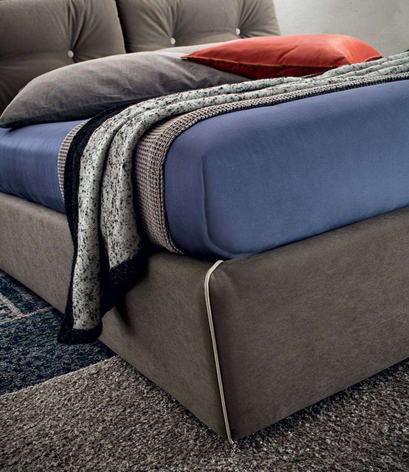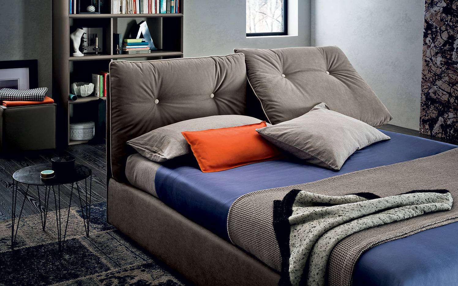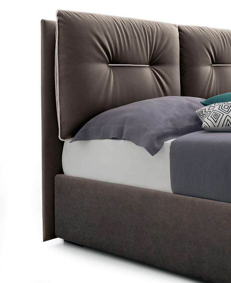 Scotty presenta due grandi cuscini in formato testiera. Il bordo a contrasto ha un impatto estetico inequivocabile e forte: delinea i bordi dei cuscini e della struttura del letto, ricreano un dettaglio stilistico e sartoriale brioso.