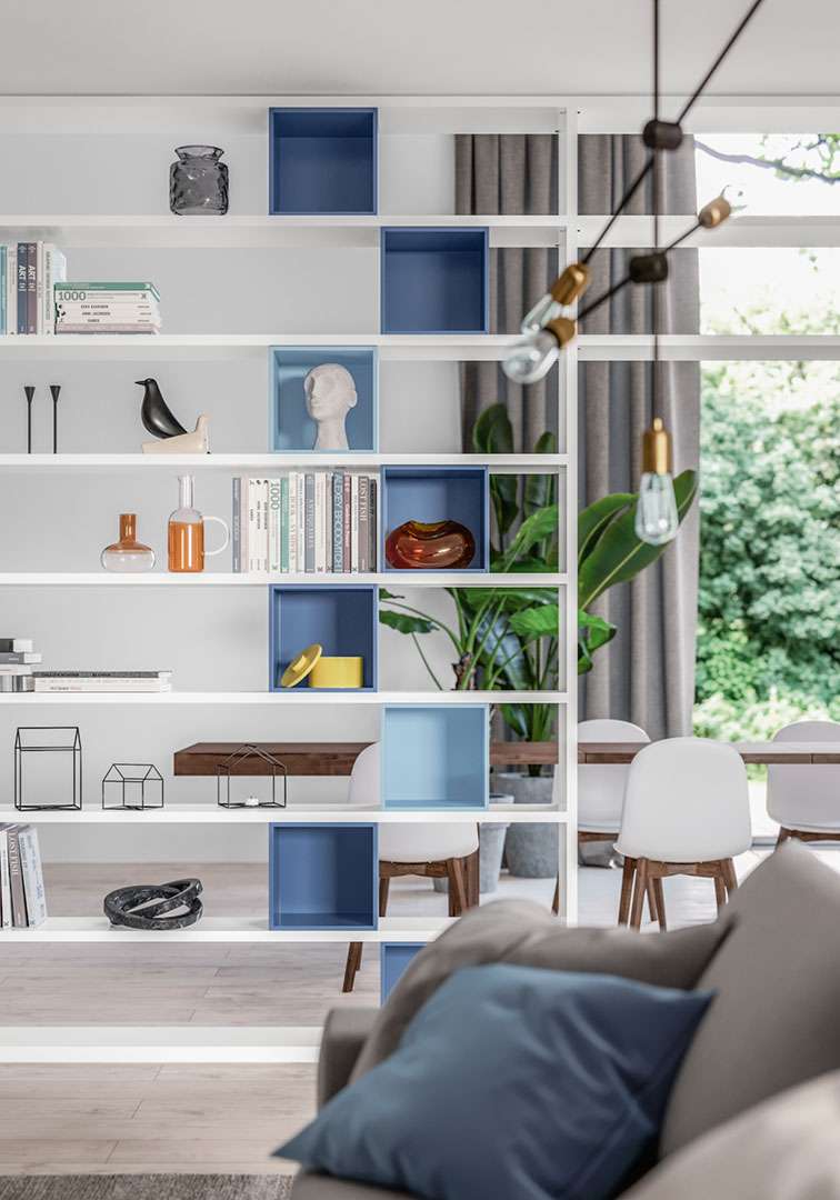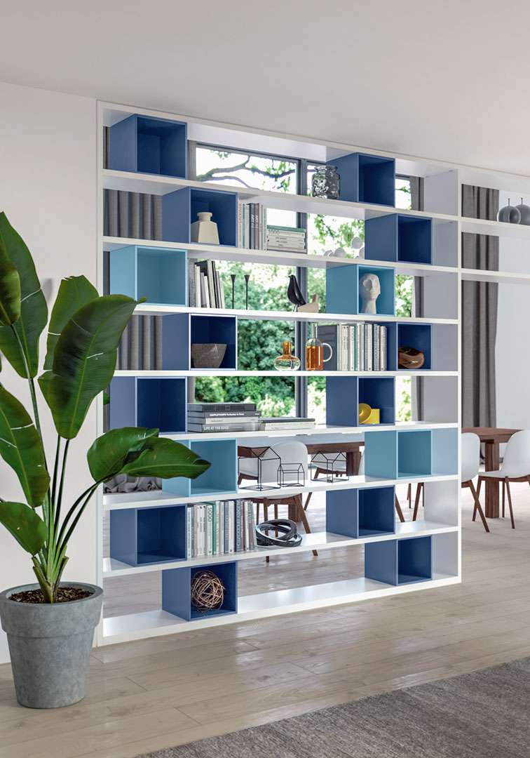 La parete attrezzata divisoria è la soluzione architettonica pensata per separare e contenere con leggerezza e libertà. Oltre alla libreria bifacciale, la madia abbinata completa il living: guarda le foto.