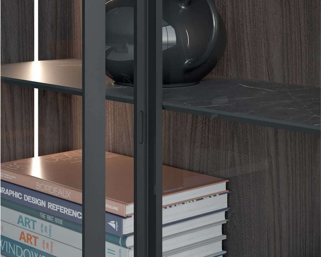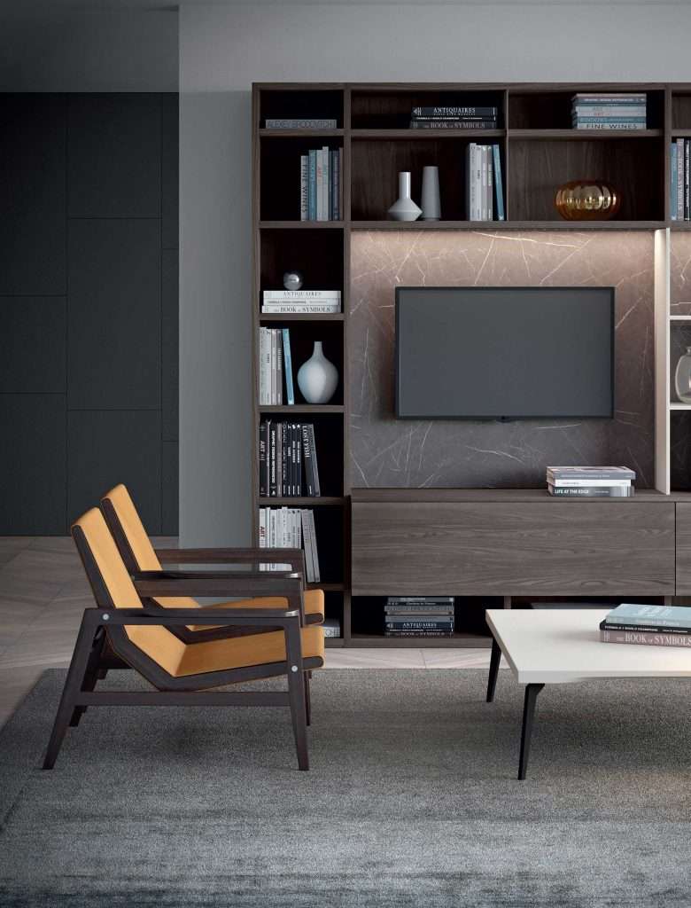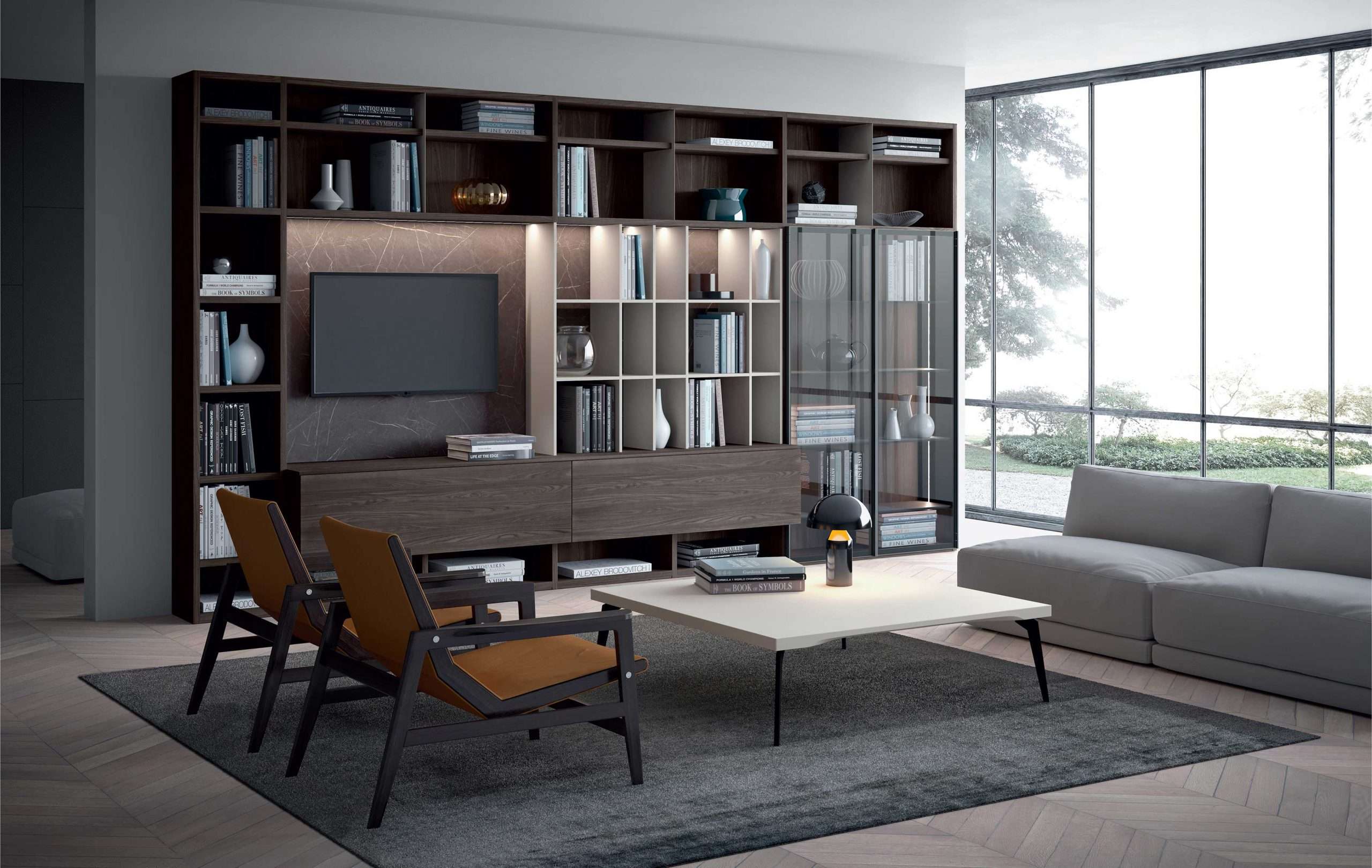 Composizione Mood con struttura, schienale e ante a ribalta in olmo autunno, divisori in metallo Blade laccati grigio 42, illuminazione led integrata nei ripiano. Nella parte centrale struttura da 16 mm e ripiani con ferramenta a scomparsa laccato opaco grigio cenere 42. Ante in vetro trasparente e profilo alluminio con maniglia integrata. Gli schienali del vano tv e i ripiani nelle vetrine sono in marmo grigio effetto soft touch, illuminazione a led integrata nella spalla. Tavolino quadrato Small con struttura in metallo. L 443 x P 34/46 x H 244 cm