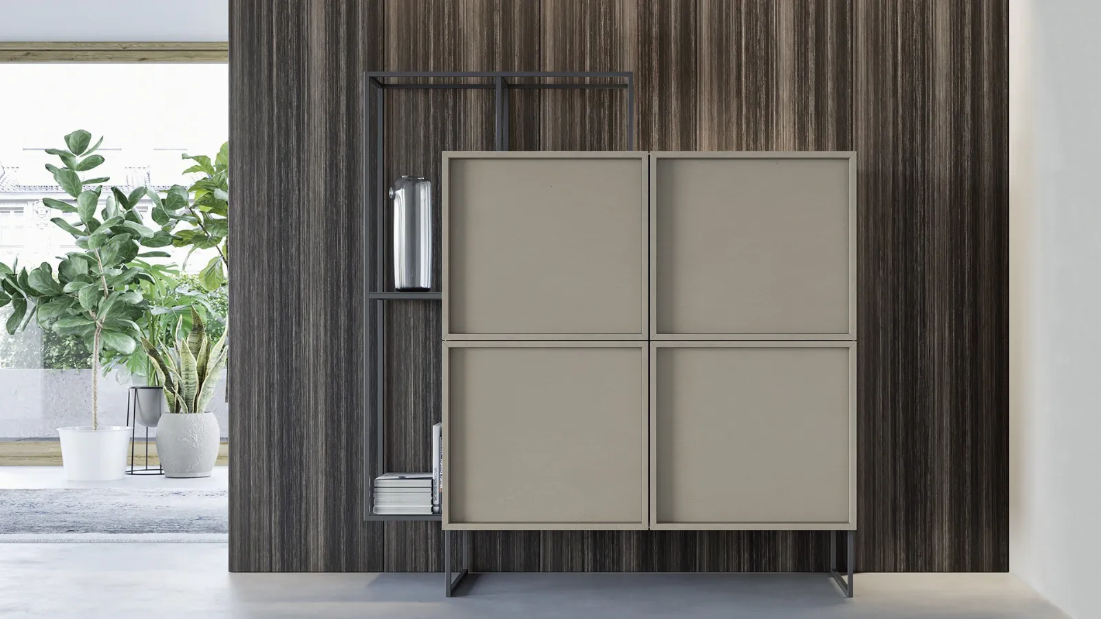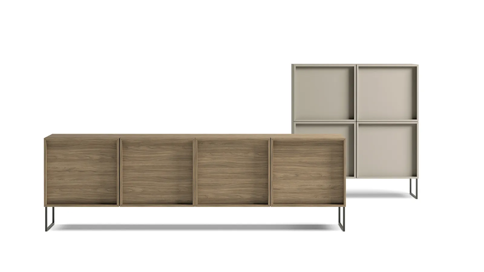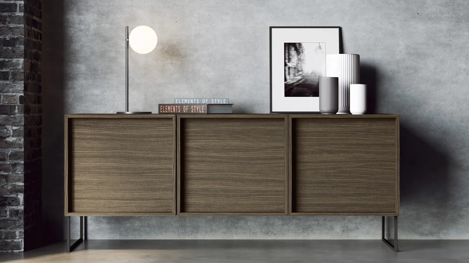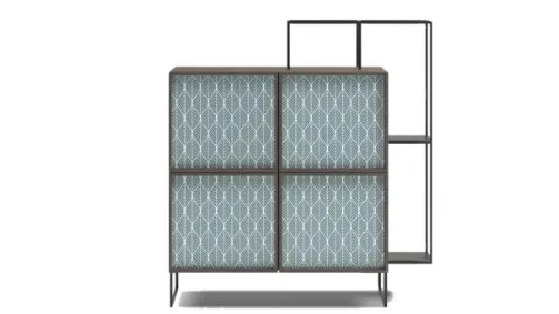 Le sue linee son definite dal basamento in metallo che prosegue lungo tutto il perimetro frontale della madia creando un look esclusivo di materiali e colori.
