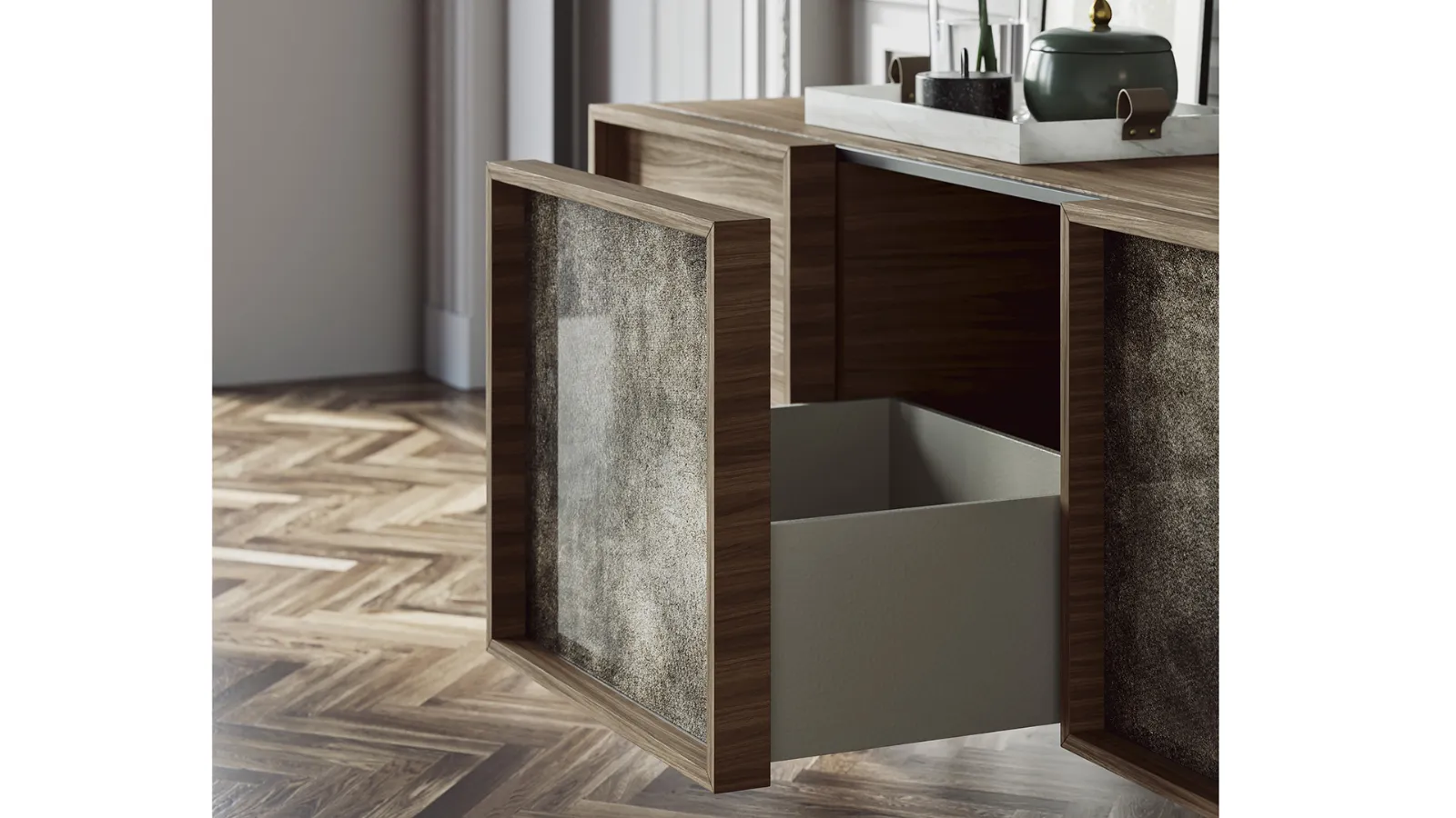Le forme geometriche della madia Alma sono definite dalle sue ante realizzate con un riquadro il cui interno può essere personalizzato con l’applicazione di inserti disponibili in vari materiali quali vero serigrafato, elementi laccati o carta da parati.