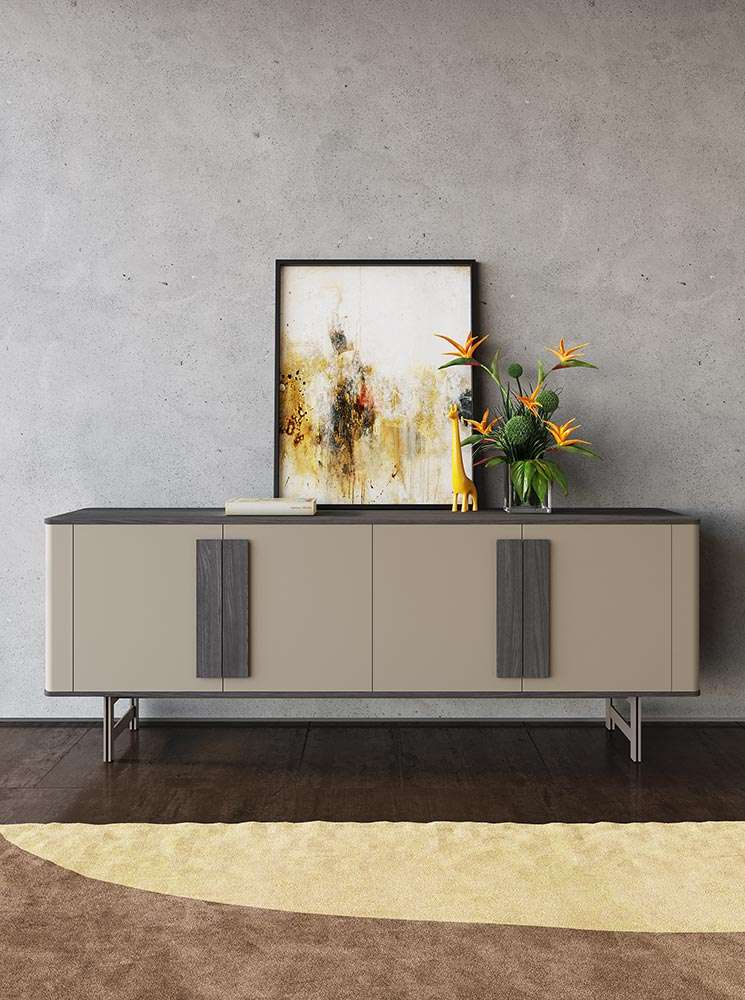 Madia Manhattan in laccato castoro, top, basamento e maniglia in olmo autunno, struttura in metallo laccato champagne. Dimensioni: L 220 H 83,2 P 53,8 cm