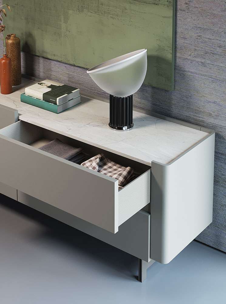 Madia Surf in laccato grigio silk, top in hpl marble sand e struttura in metallo laccato titanio. Dimensioni: L 220 H 81,8 P 54,7 cm