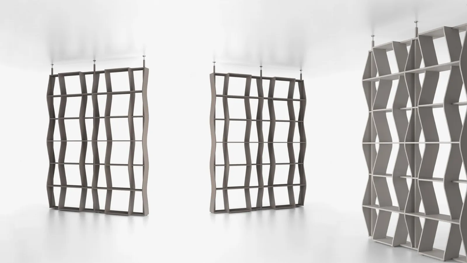 La libreria Swing è disponibile nella versione a parete con il fissaggio a muro o nella versione centro stanza con il fissaggio a soffito tramite dei pali telescopici.