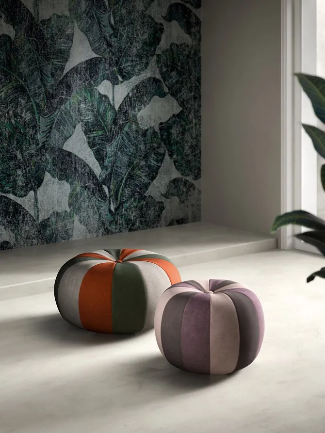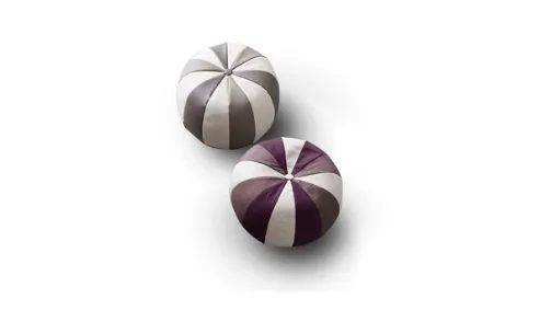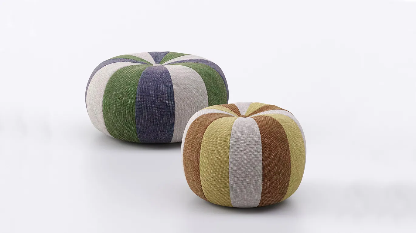 Il pouf Bound ha una forma sferica e può essere realizzato con rivestimenti monocolore oppure in vari colori (a spicchi) fino ad un massimo di quattro colori diversi.