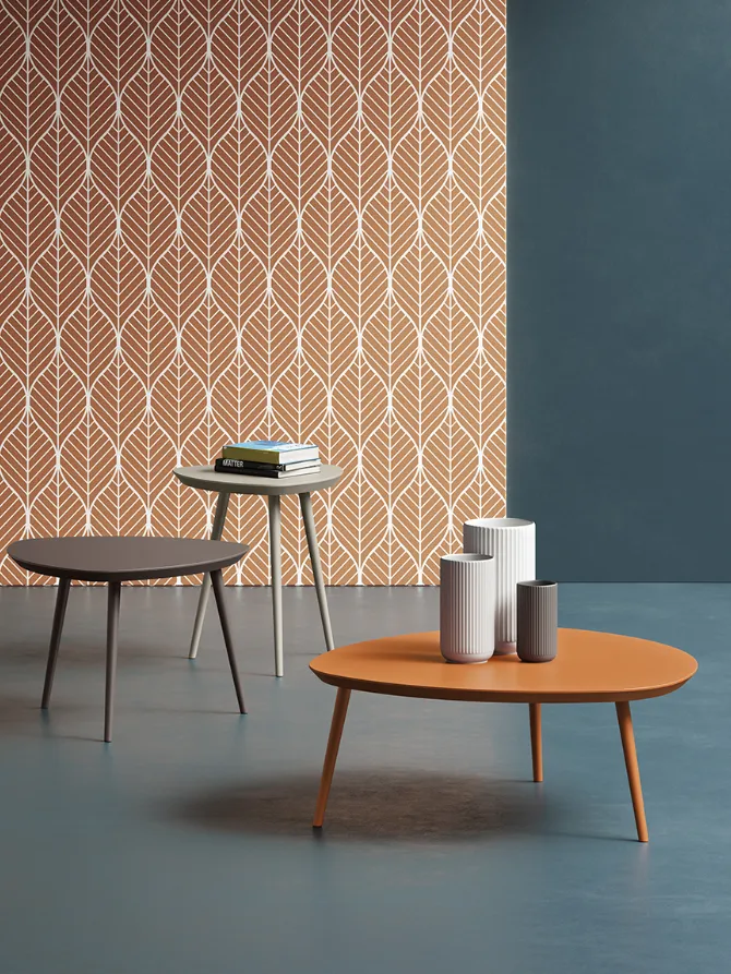 Tavolino moderno dal design scandinavo costituito da un piano in MDF pantografato con bordo a 45° e forma triangolare con angoli arrotondati e sorretto da tre gambe in legno a sezione circolare.