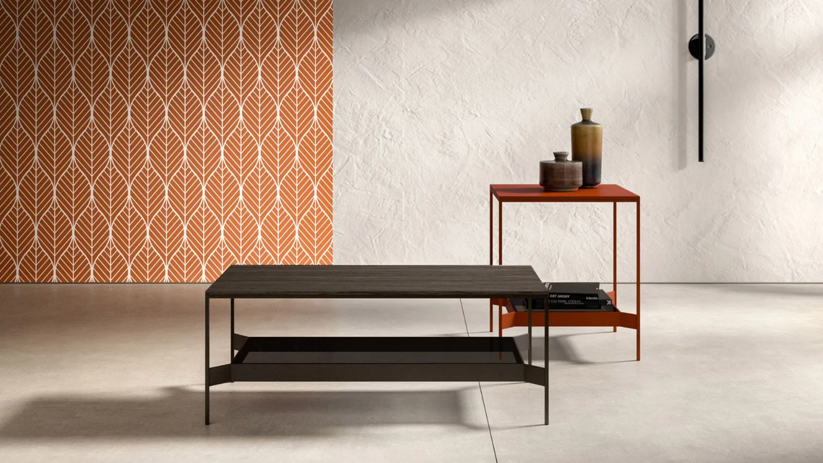 Il piano superiore può essere realizzato in nobilitato, in laccato, in vetro fumè e in Laminam.