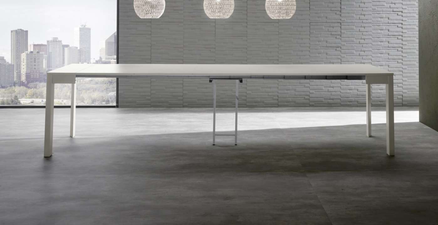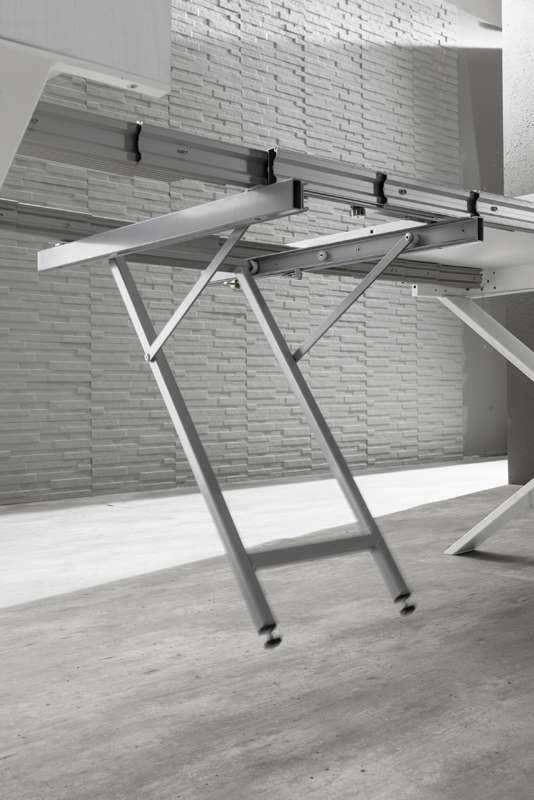 Tavolo consolle allungabile con struttura in metallo laccato, piana e allunghe in melaminico, guida telescopica in alluminio e supporto centrale ad estrazione automatica..