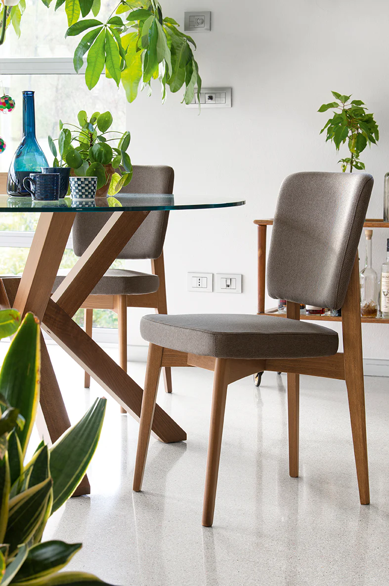 Sedia modello ESCUDO dalla struttura in legno di faggio massello tinto. Sedile e schienale rivestito in tessuto.La cura progettuale delle linee rende questo prodotto piacevole e nello stesso tempo ergonomico. Questo progetto ci dona una sedia dalla massima funzionalità non solo in ambiente domestico ma anche per i bar, ristorazione e comunità.
