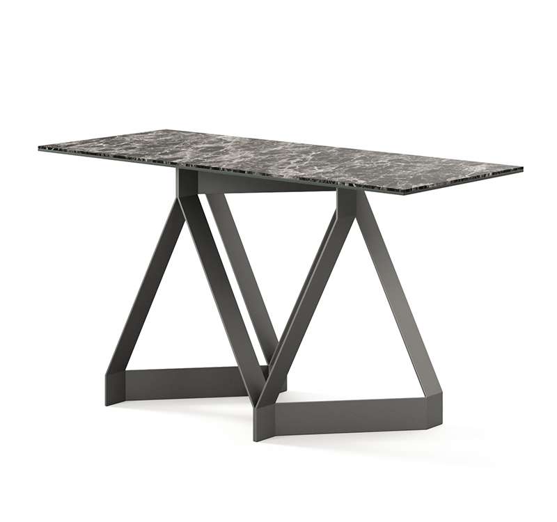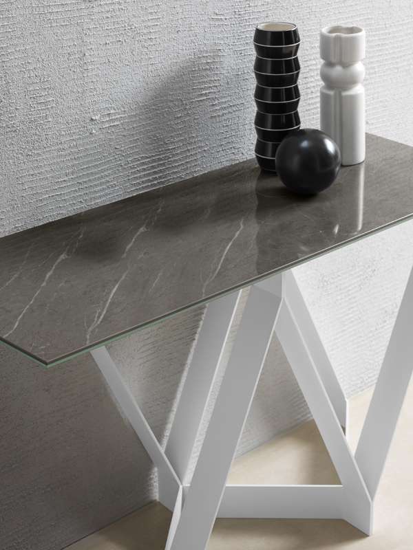 Consolle fissa con struttura in metallo verniciato e piana in ceramica opaca o lucida.