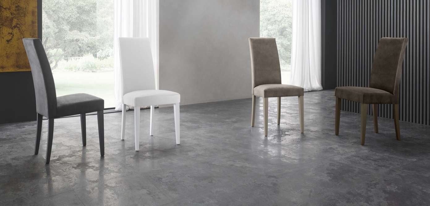 Sedia con struttura in legno e seduta rivestita in vari materiali e finiture.