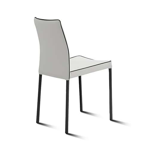 Sedia impilabile con struttura in metallo verniciato nero industry e seduta rivestita in vari materiali e finiture, bordino in ecopelle.