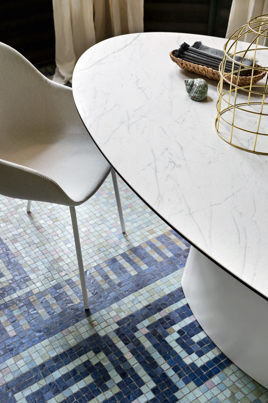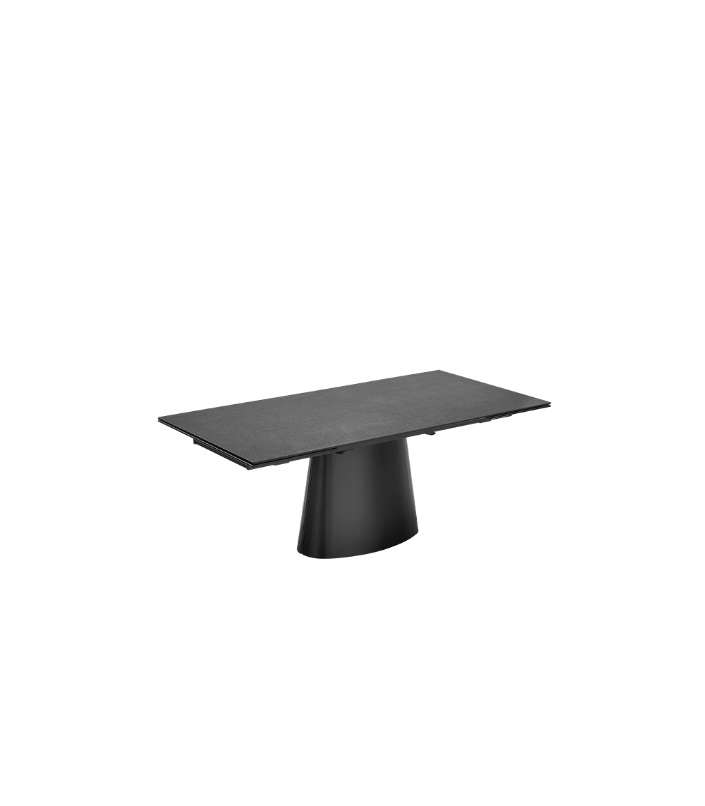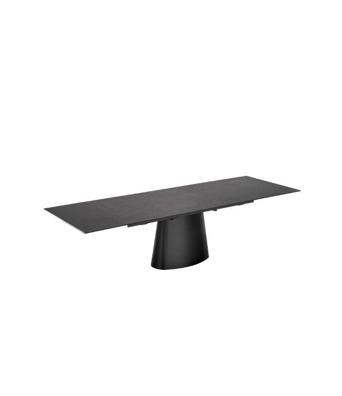 Design monolitico ed essenziale risulta elegante in ogni ambiente e perfetto per ogni tipo di arredamento. Ellisse è un tavolo allungabile con piani in ceramica ed una base monolitica in lamiera curvata verniciata.