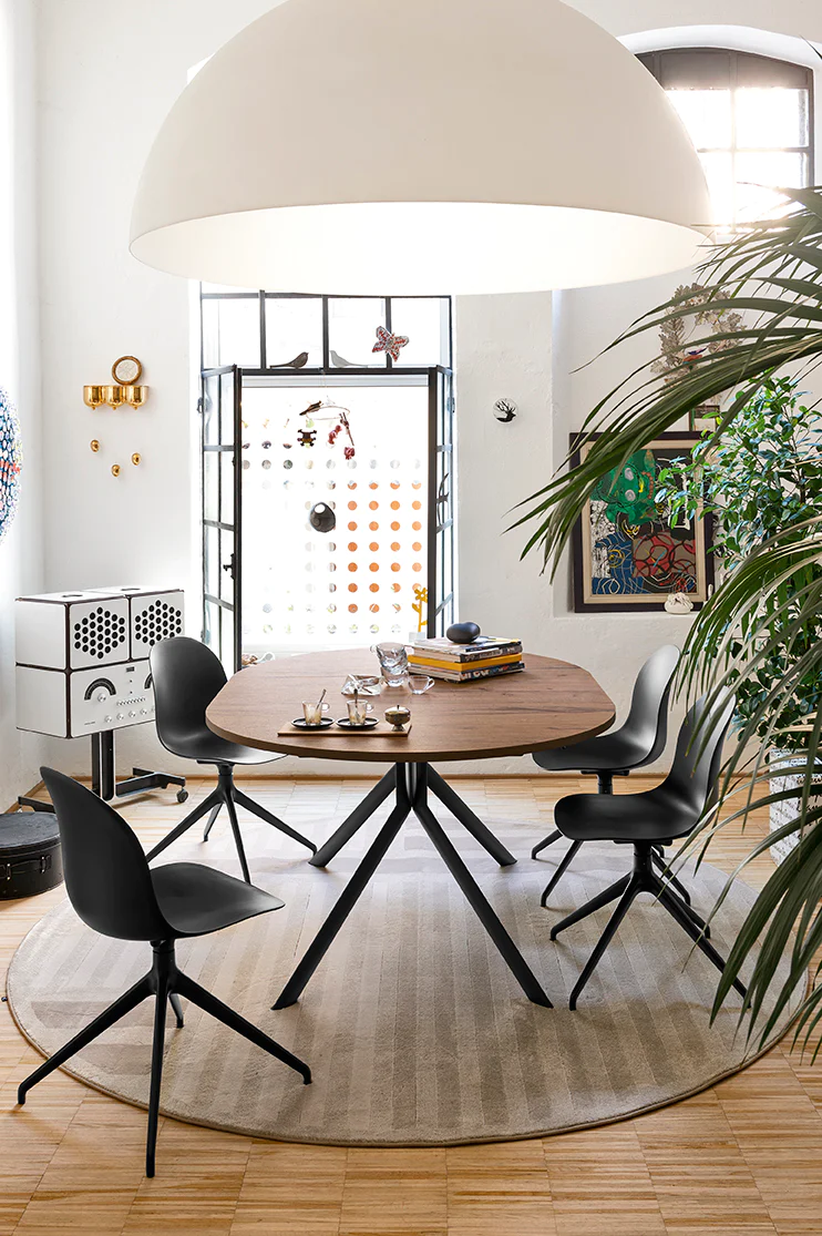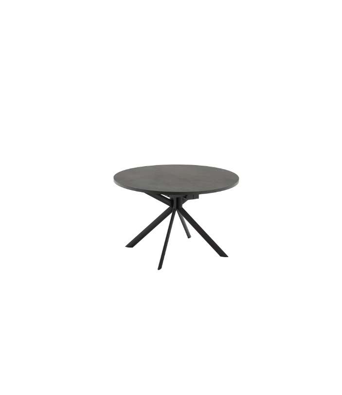 Tavolo allungabile GIOVE, basamento in metallo con piano tondo in legno, legno-ceramica o legno-vetro. Base centrale in metallo fissa con quattro gambe inclinate a sezione ellittica e meccanismo di apertura a libro con allunga centrale in tinta con la base. Le linee semplici e decise lo rendono adatto ad ogni spazio abitativo.