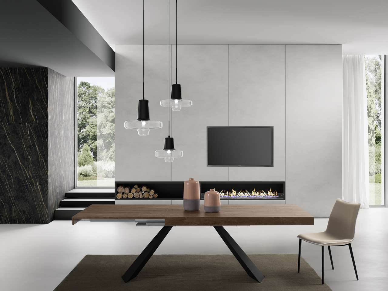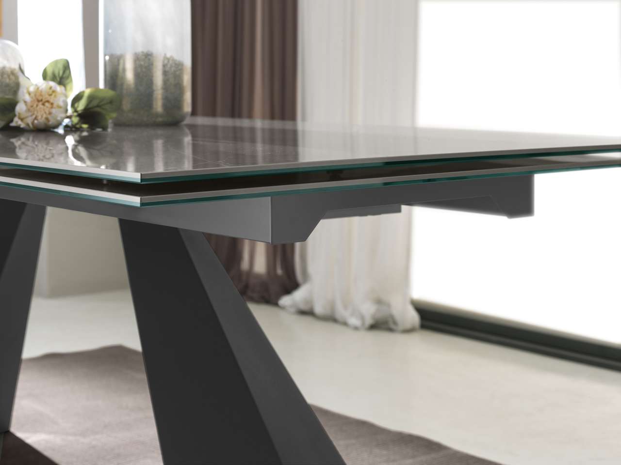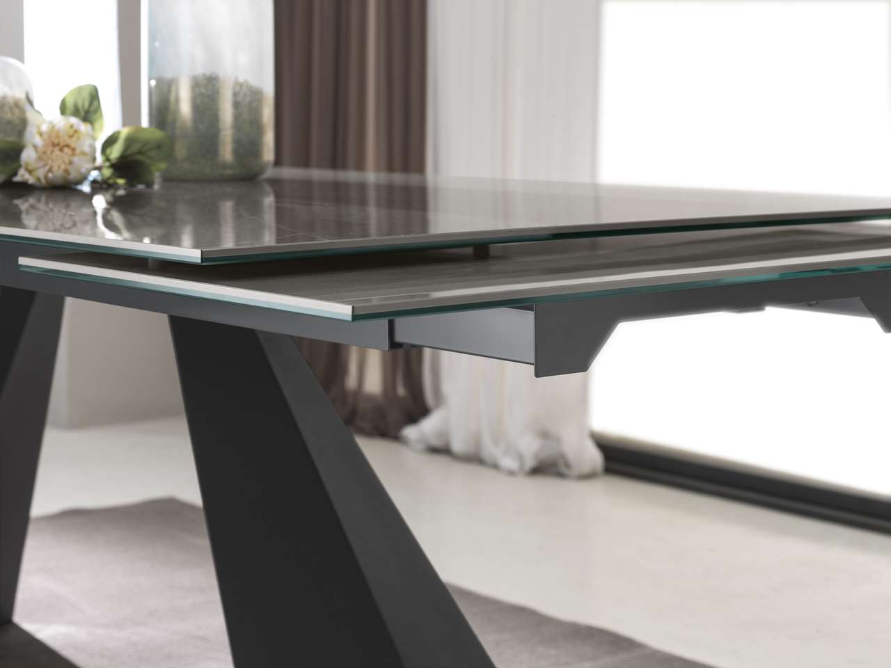 Tavolo fisso o allungabile, con base in metallo verniciato e piano disponibile in diverse finiture e dimensioni, sia nella versione allungabile che fissa