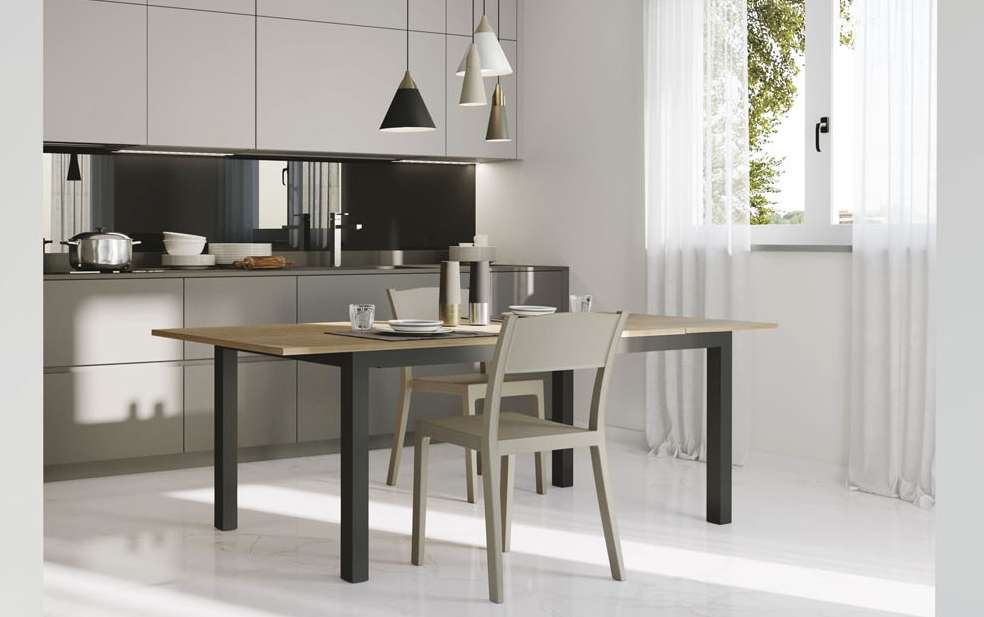 Tavolo fisso o allungabile con basamento in metallo verniciato e piana disponibile in finiture e dimensioni differenti, sia nella versione allungabile che nella versione fissa.
