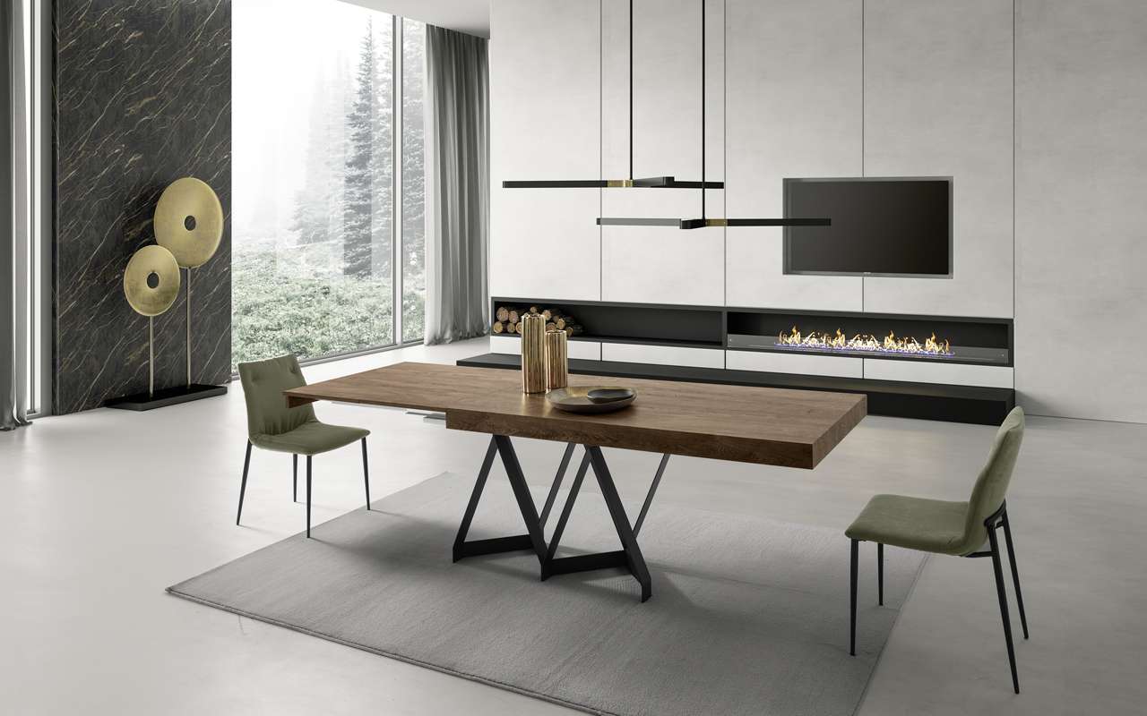 Tavolo fisso o allungabile, con base in metallo verniciato e piano disponibile in diverse finiture e dimensioni, sia nella versione allungabile che fissa
