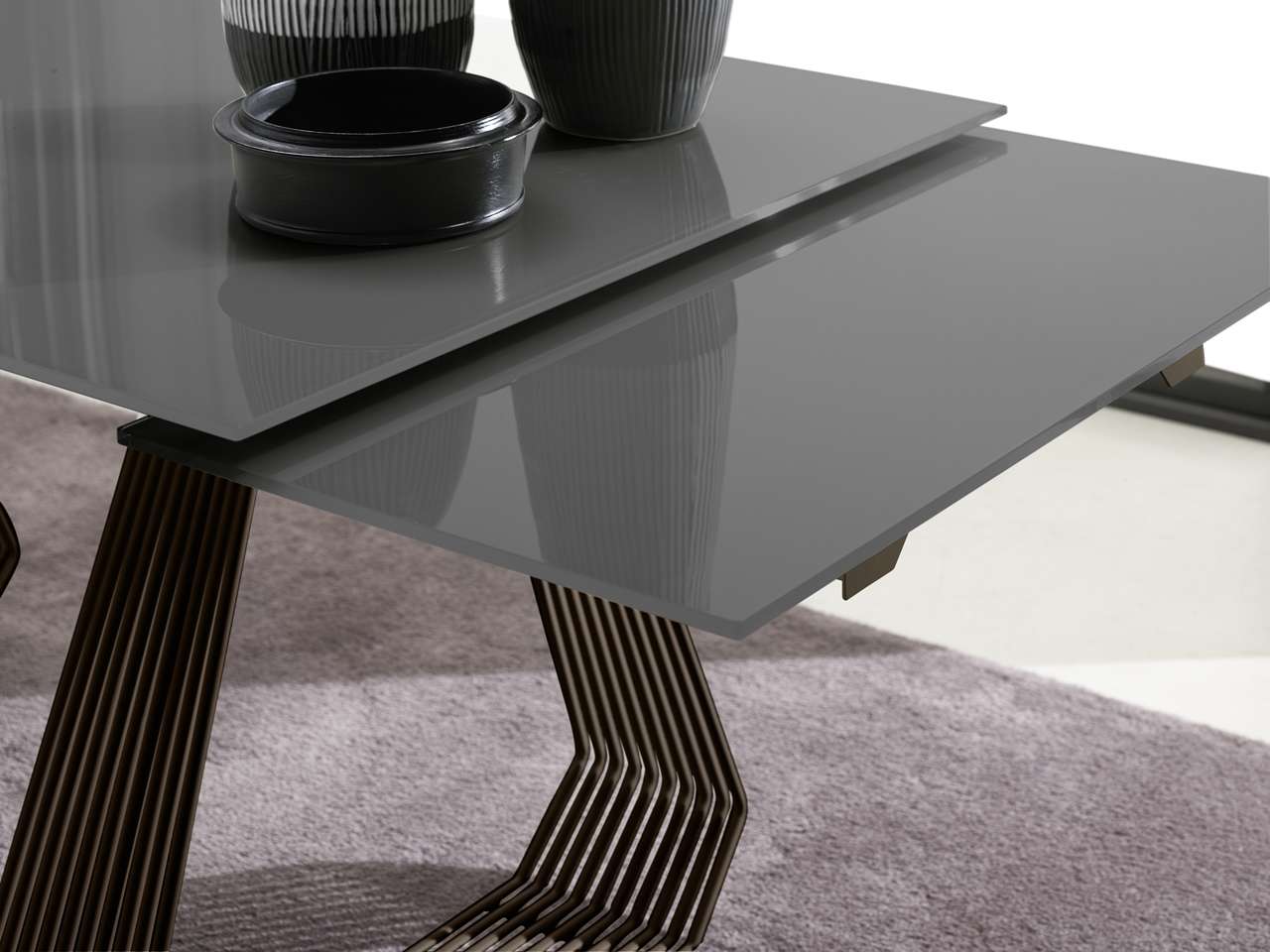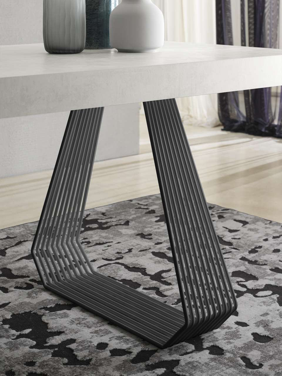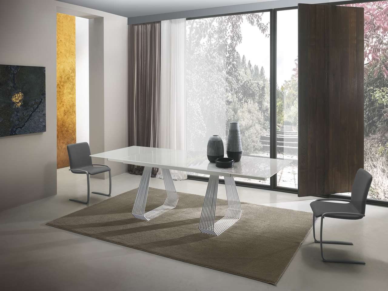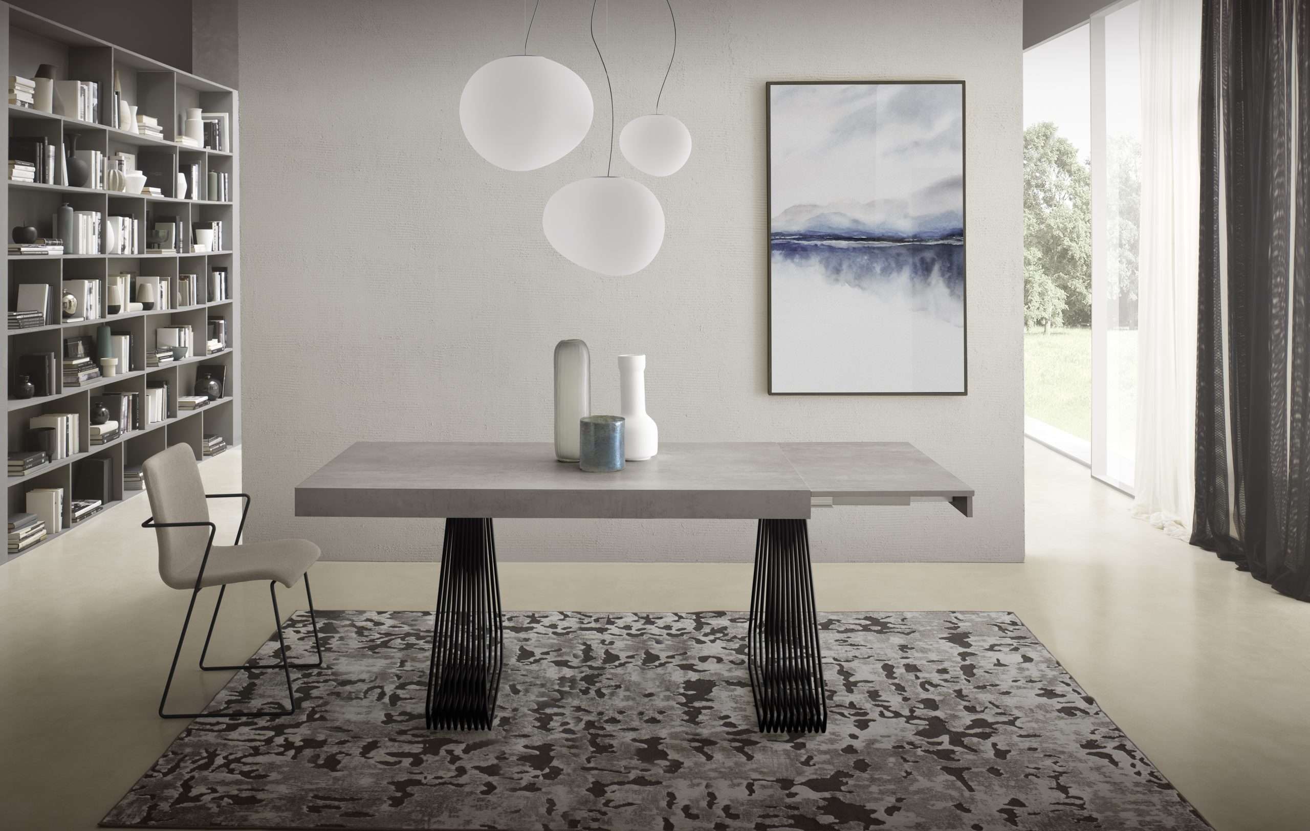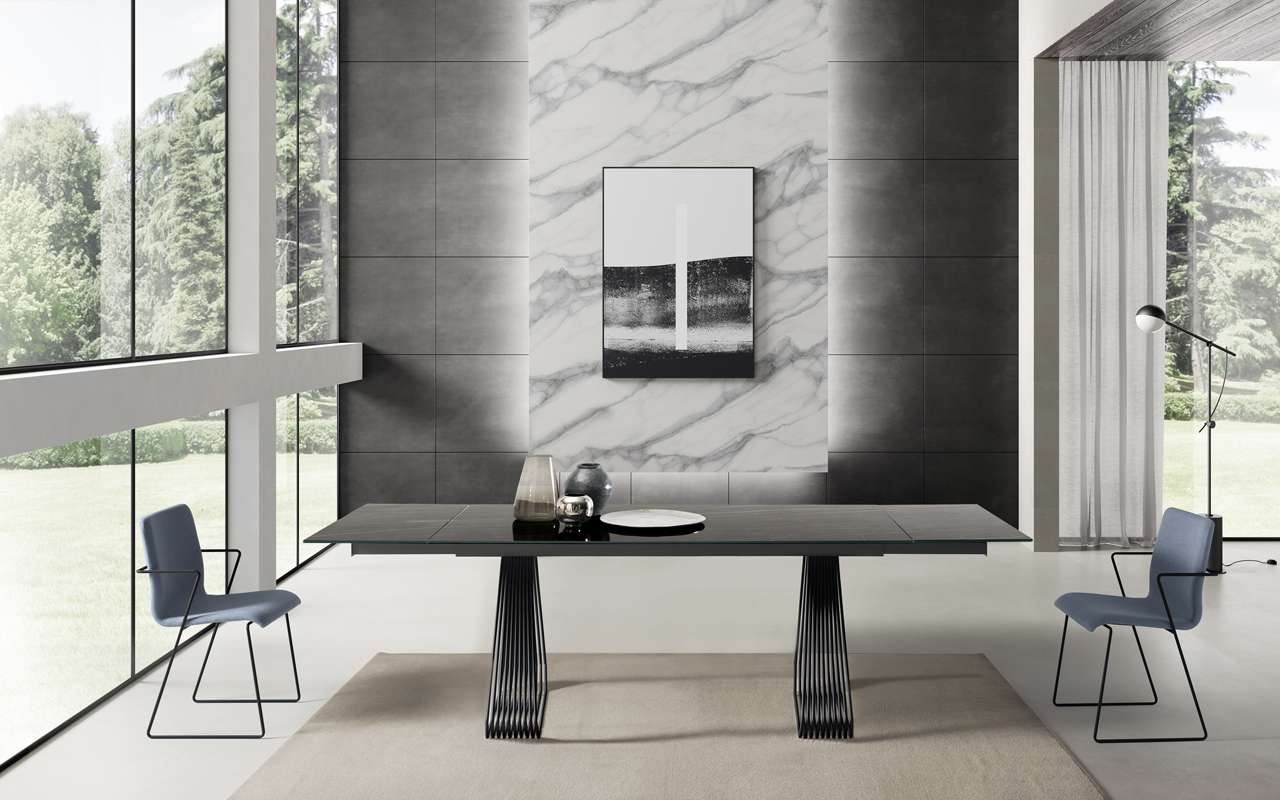 Tavolo fisso o allungabile, con basamento in metallo verniciato e piana disponibile in finiture e dimensioni differenti, sia nella versione allungabile che nella versione fissa.